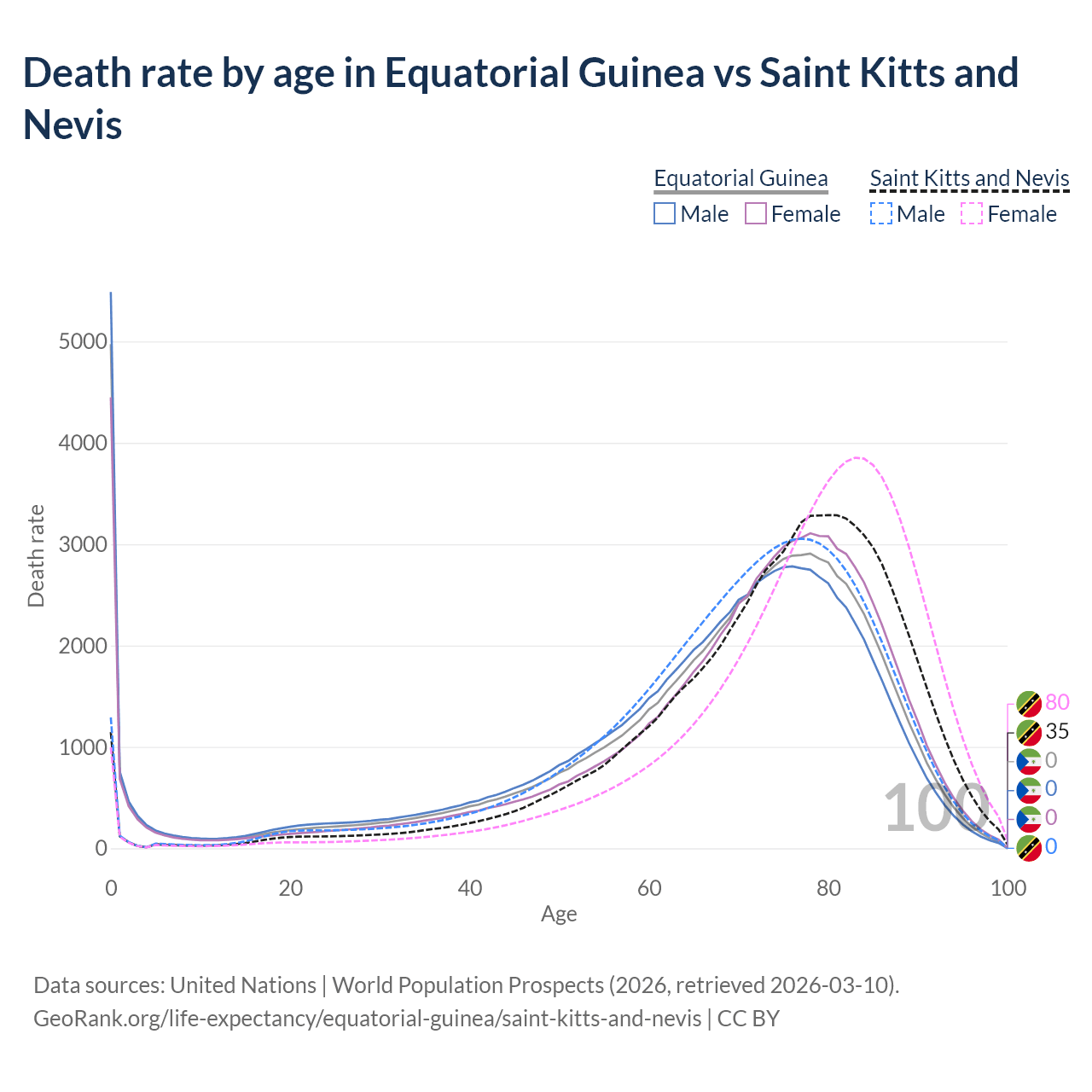 In Equatorial Guinea, the most common age of death is 0, compared to 80 in Saint Kitts and Nevis. The median age of death is 71.3 in Equatorial Guinea and 76.3 in Saint Kitts and Nevis, meaning only half of each cohort is expected to live past that age.