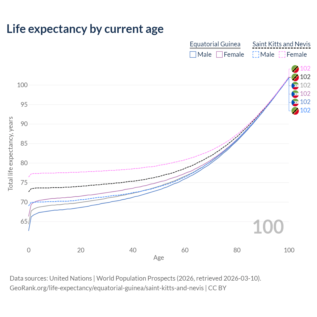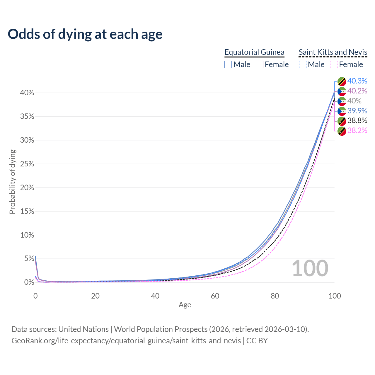 This life expectancy calculator shows the odds of living to 100, 95, 90, and below based on current age for both males and females in Equatorial Guinea and Saint Kitts and Nevis, along with mean and median age of death. The calculations are based on the 2026 life tables (actuarial tables) from the UN World Population Prospects.