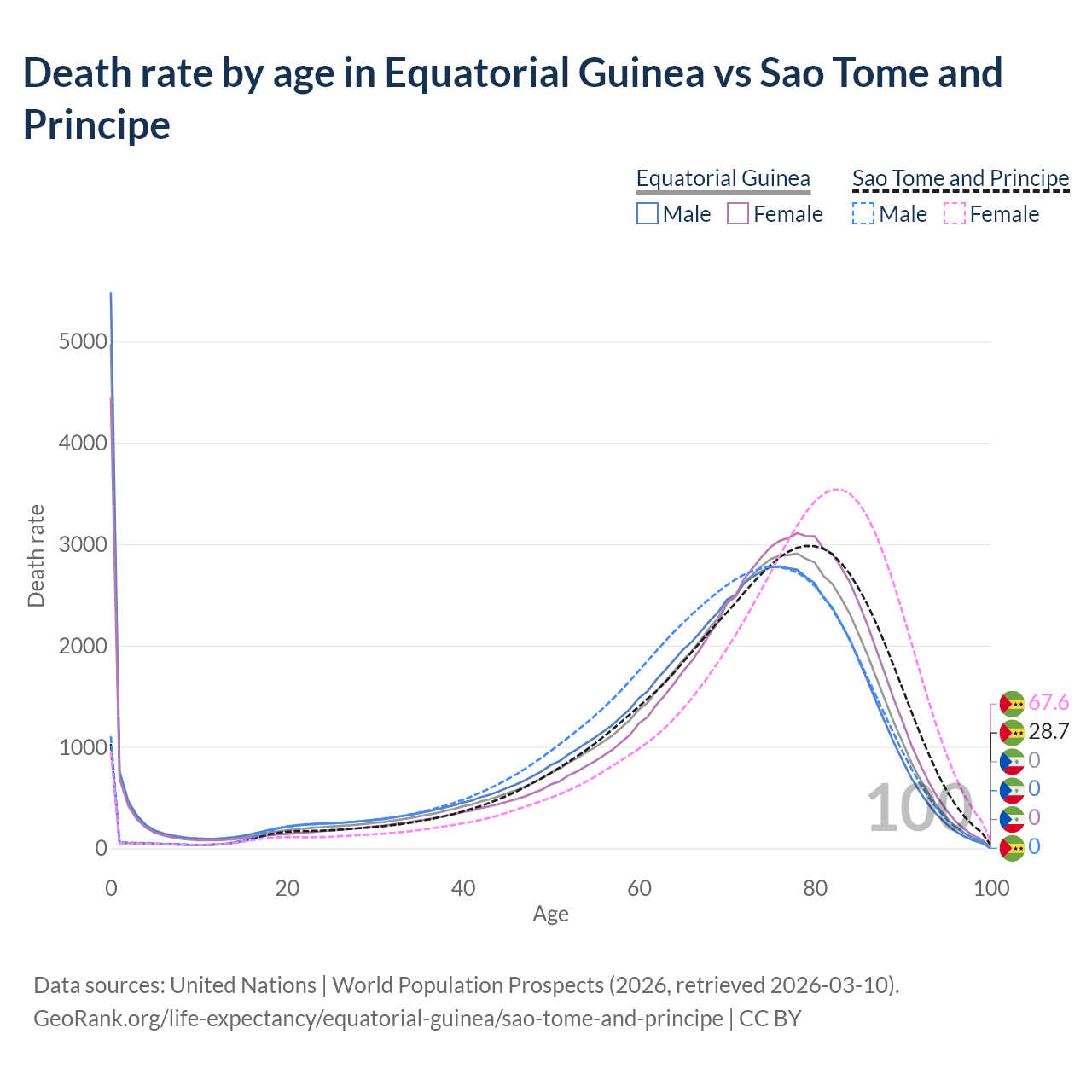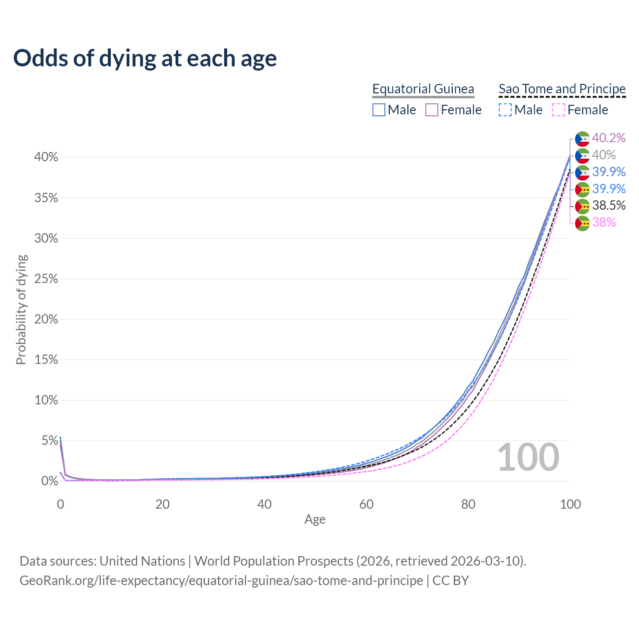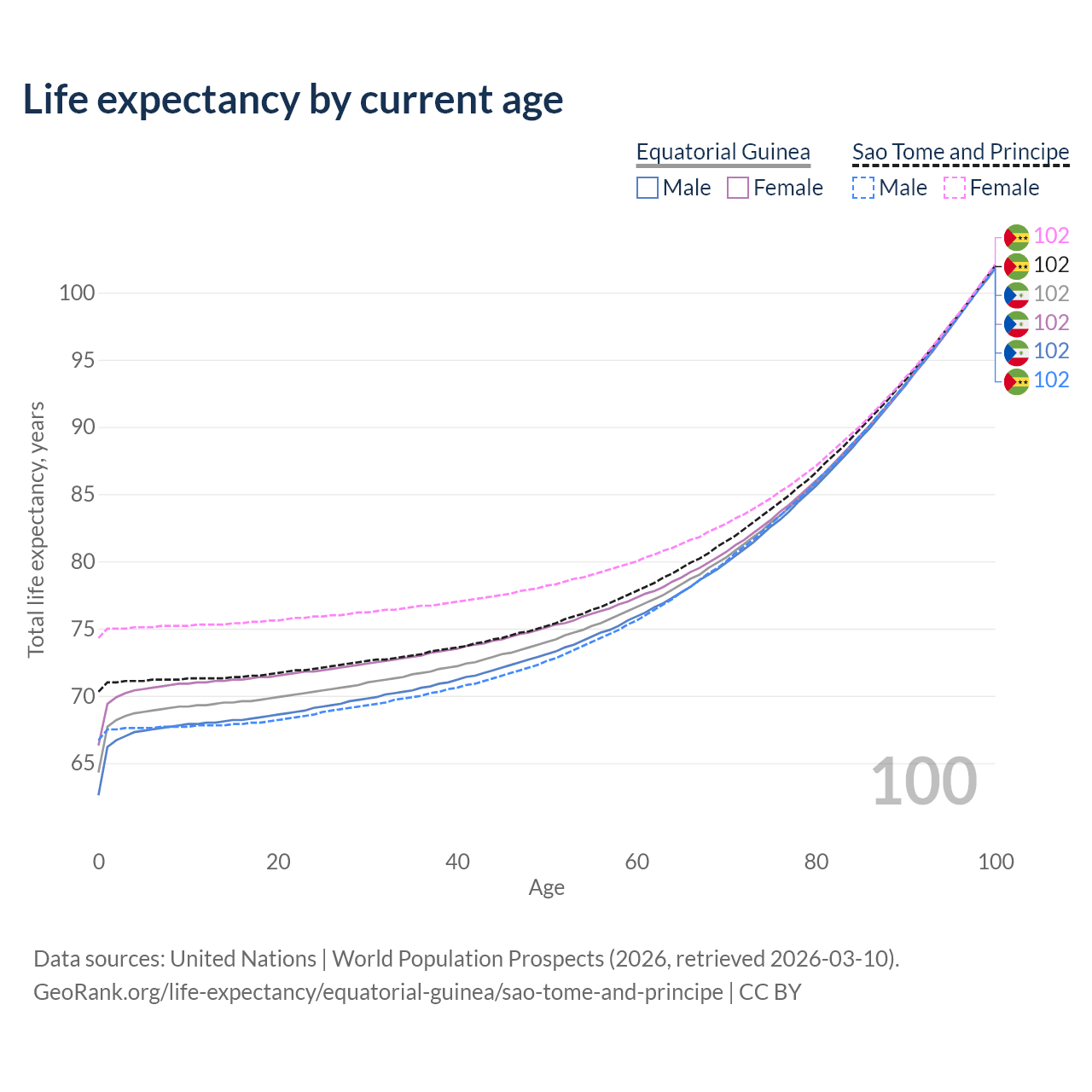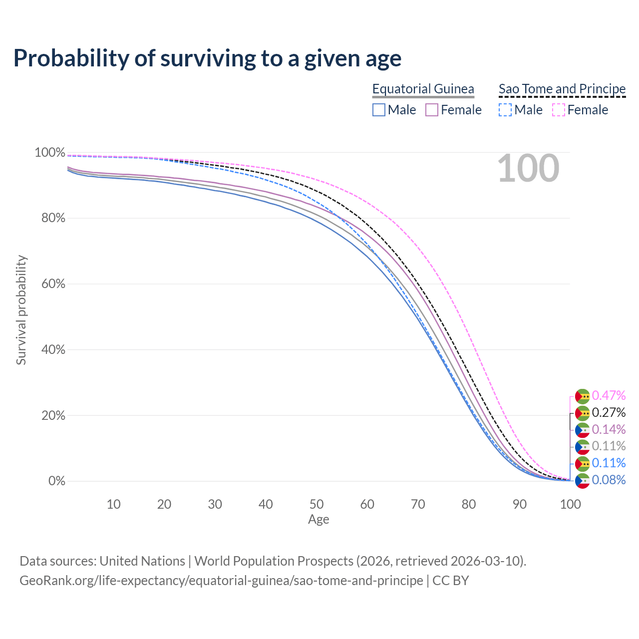 This life expectancy calculator shows the odds of living to 100, 95, 90, and below based on current age for both males and females in Equatorial Guinea and Sao Tome and Principe, along with mean and median age of death. The calculations are based on the 2026 life tables (actuarial tables) from the UN World Population Prospects.
