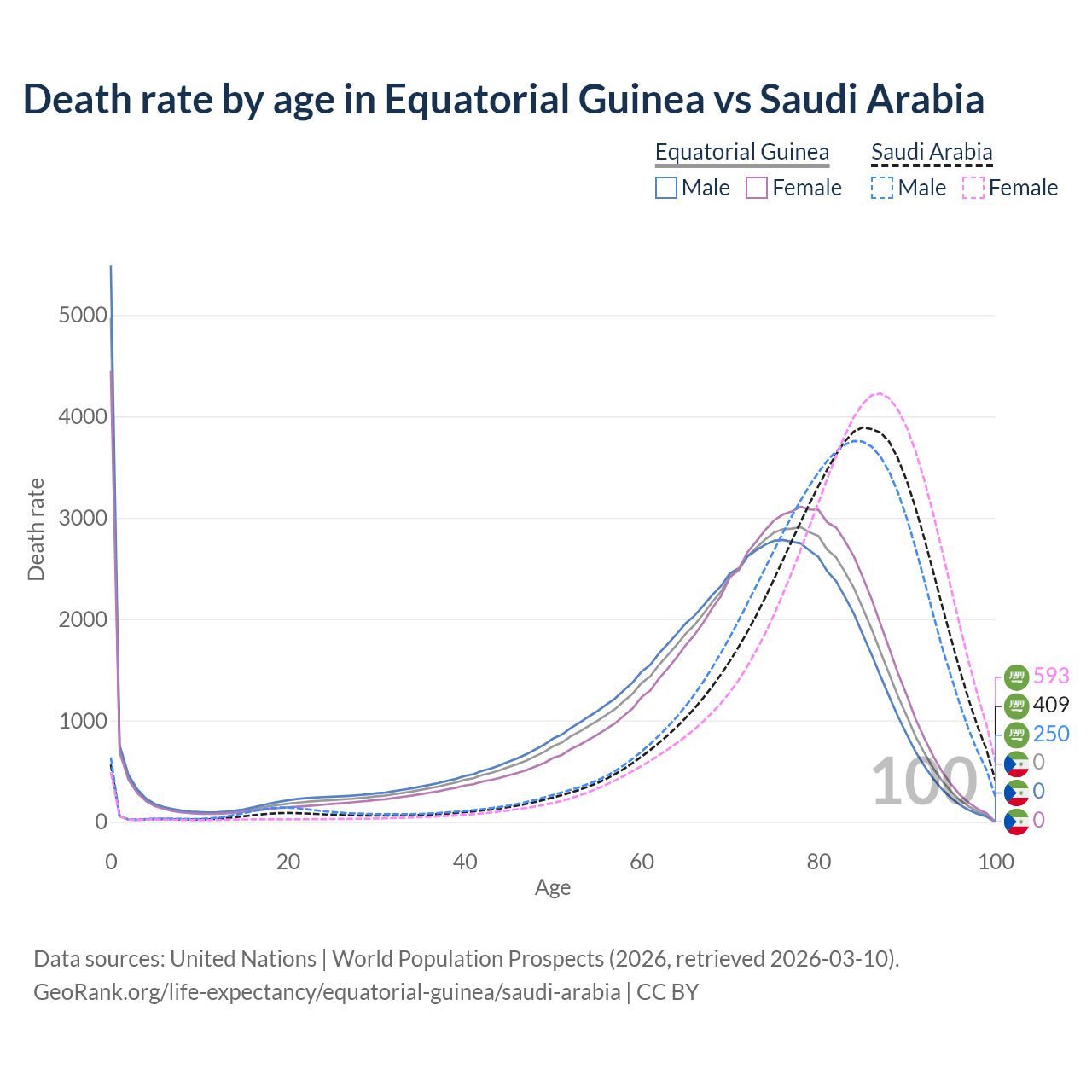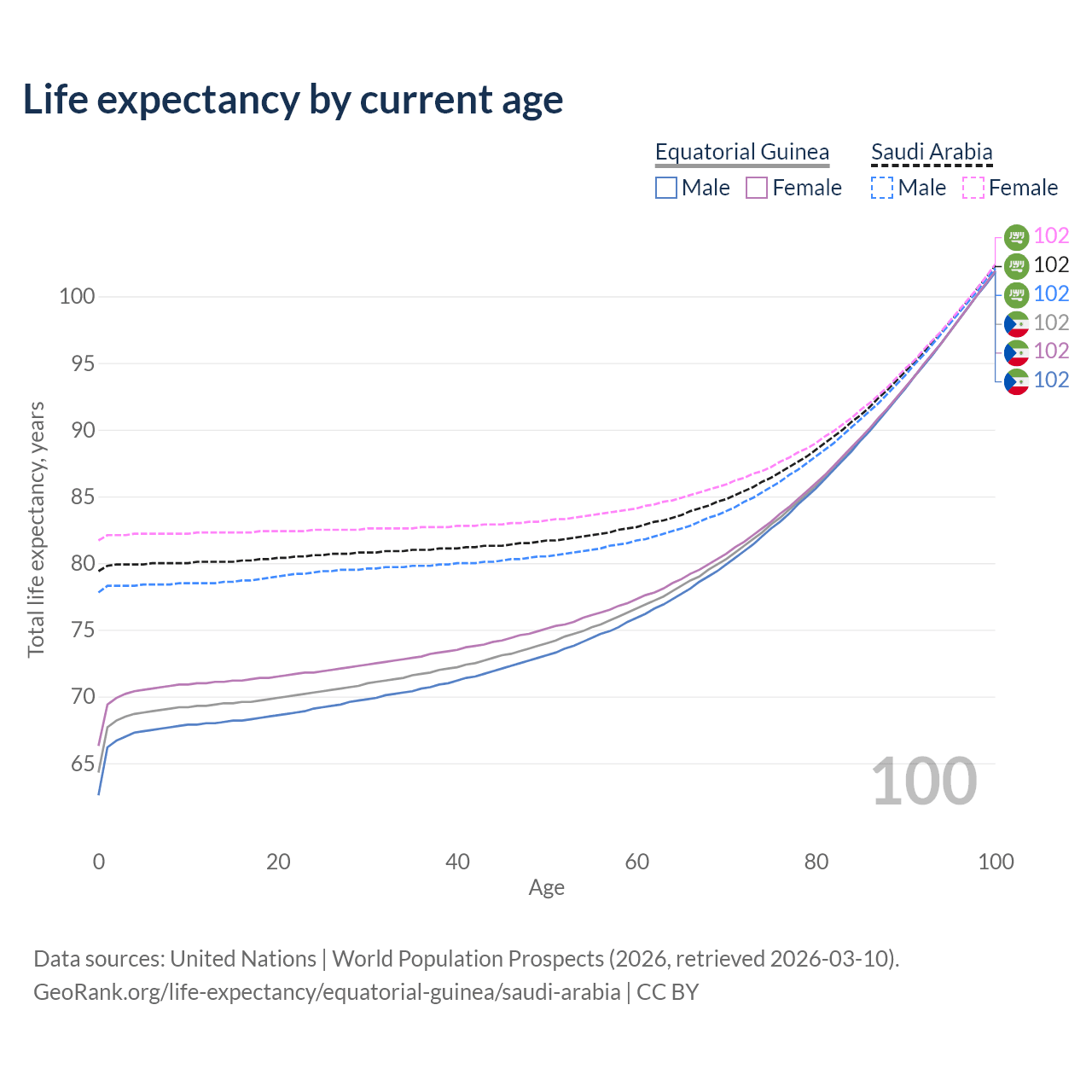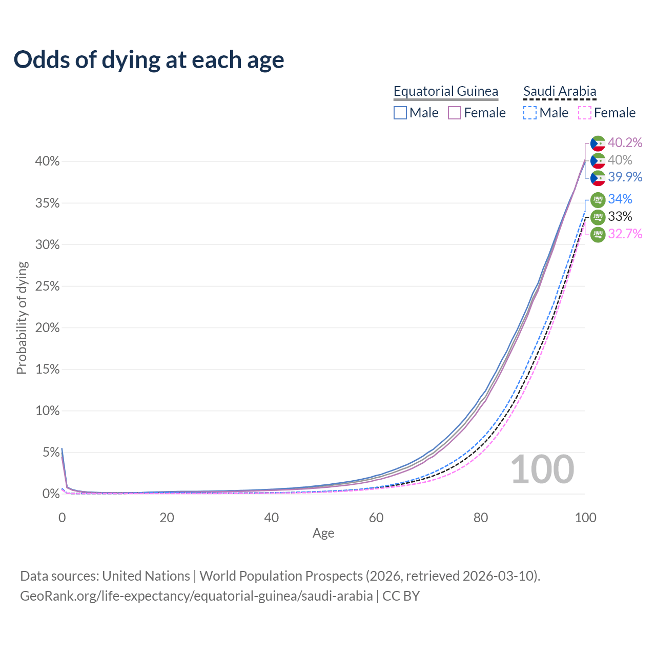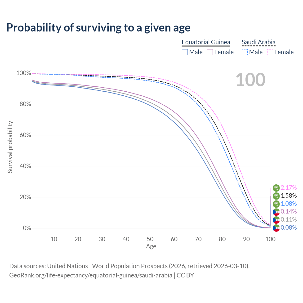 This life expectancy calculator shows the odds of living to 100, 95, 90, and below based on current age for both males and females in Equatorial Guinea and Saudi Arabia, along with mean and median age of death. The calculations are based on the 2026 life tables (actuarial tables) from the UN World Population Prospects.