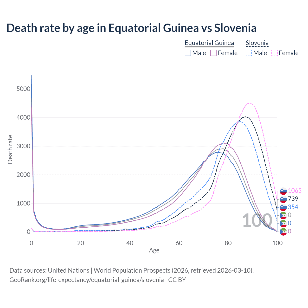 In Equatorial Guinea, the most common age of death is 0, compared to 87 in Slovenia. The median age of death is 71.3 in Equatorial Guinea and 84.4 in Slovenia, meaning only half of each cohort is expected to live past that age.