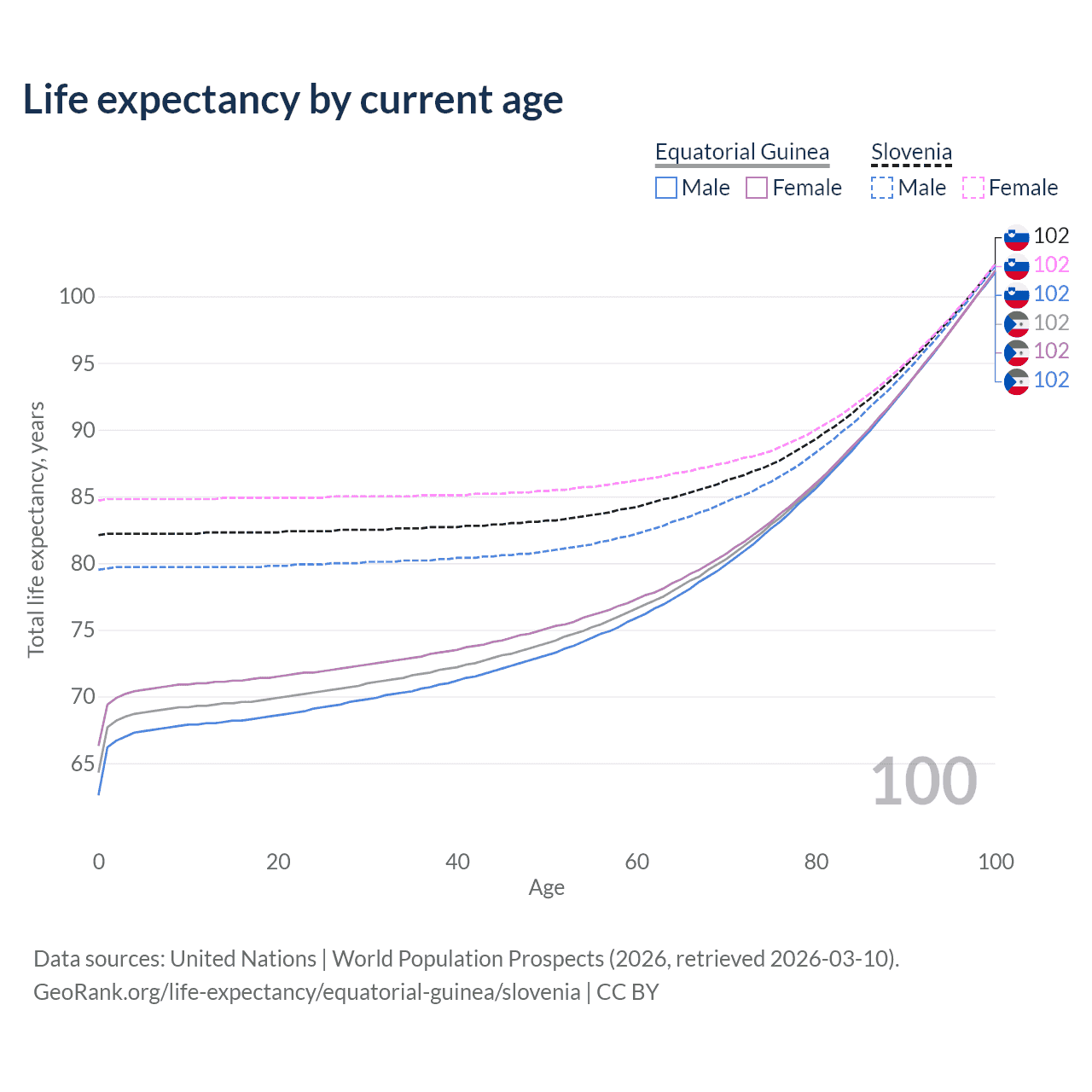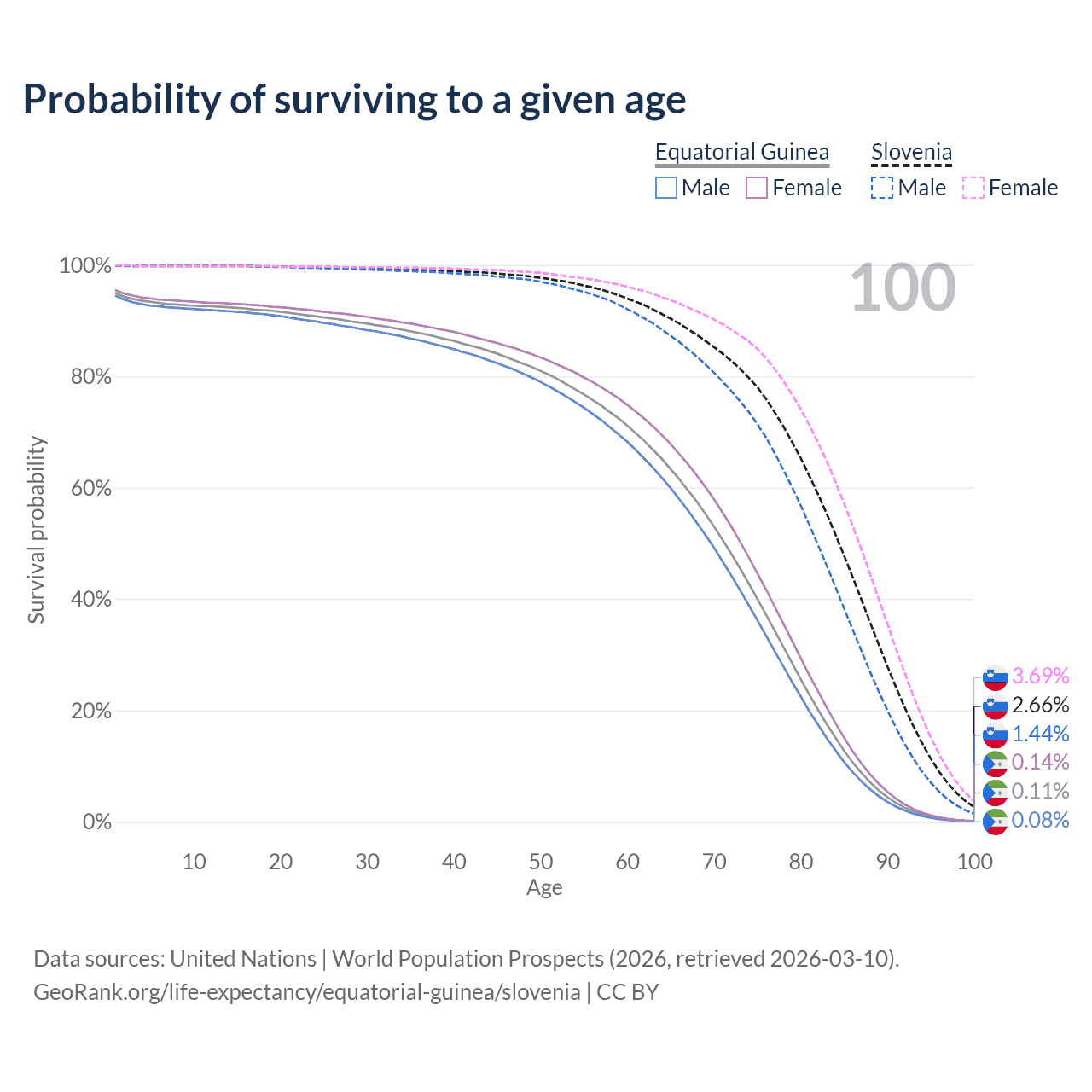 This life expectancy calculator shows the odds of living to 100, 95, 90, and below based on current age for both males and females in Equatorial Guinea and Slovenia, along with mean and median age of death. The calculations are based on the 2026 life tables (actuarial tables) from the UN World Population Prospects.