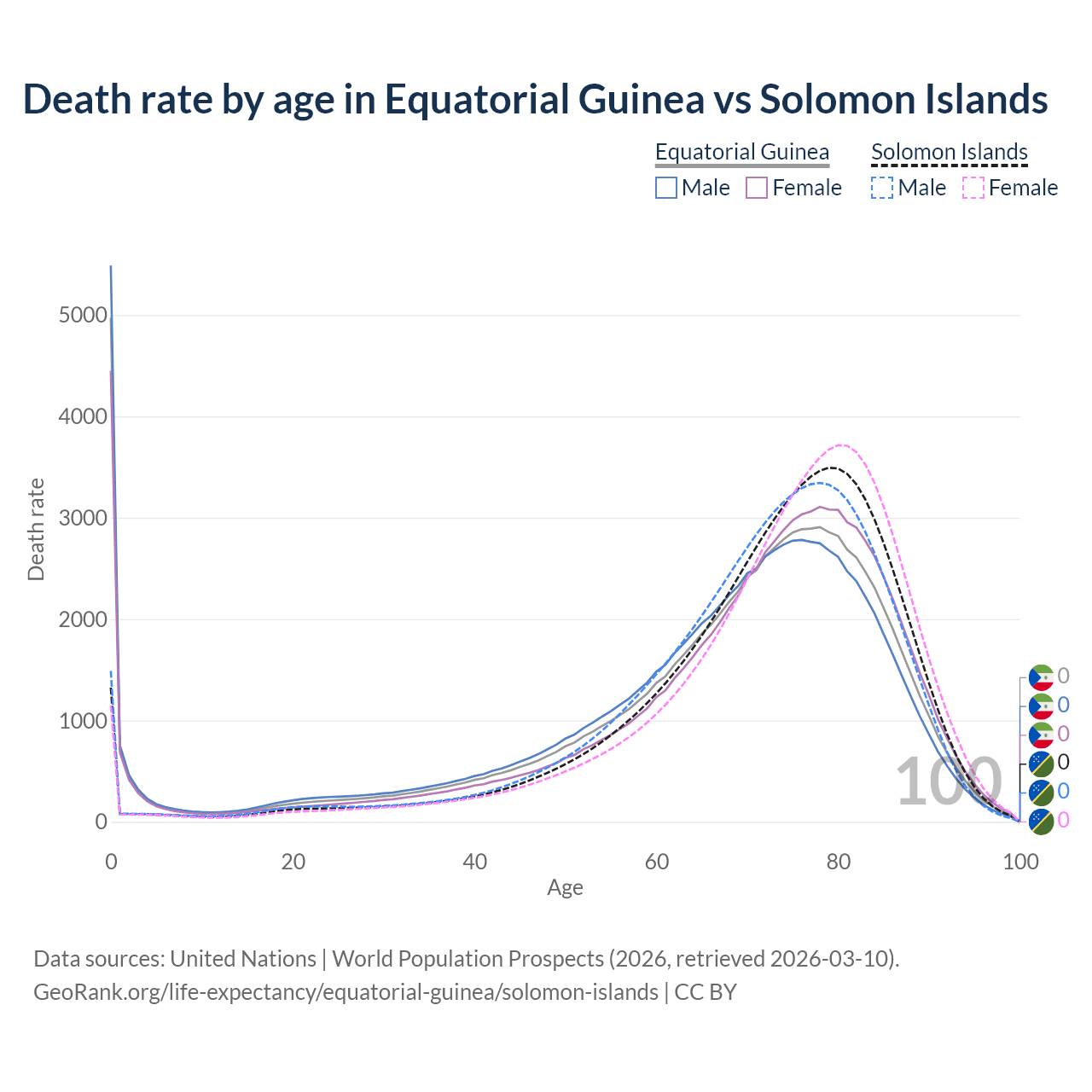 In Equatorial Guinea, the most common age of death is 0, compared to 79 in the Solomon Islands. The median age of death is 71.3 in Equatorial Guinea and 74.9 in the Solomon Islands, meaning only half of each cohort is expected to live past that age.
