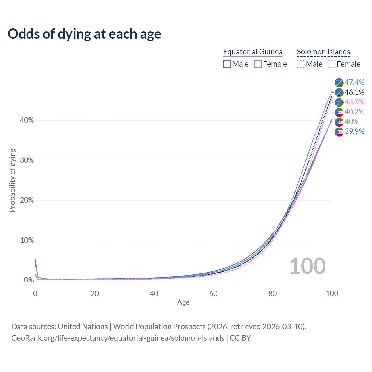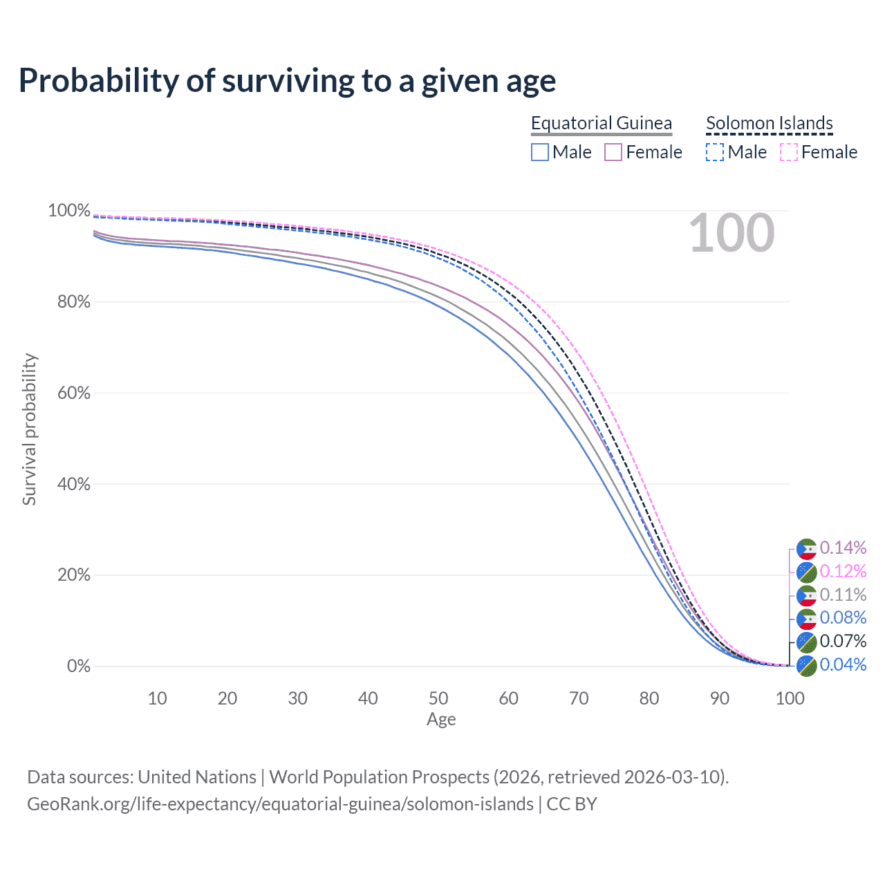 This life expectancy calculator shows the odds of living to 100, 95, 90, and below based on current age for both males and females in Equatorial Guinea and the Solomon Islands, along with mean and median age of death. The calculations are based on the 2026 life tables (actuarial tables) from the UN World Population Prospects.