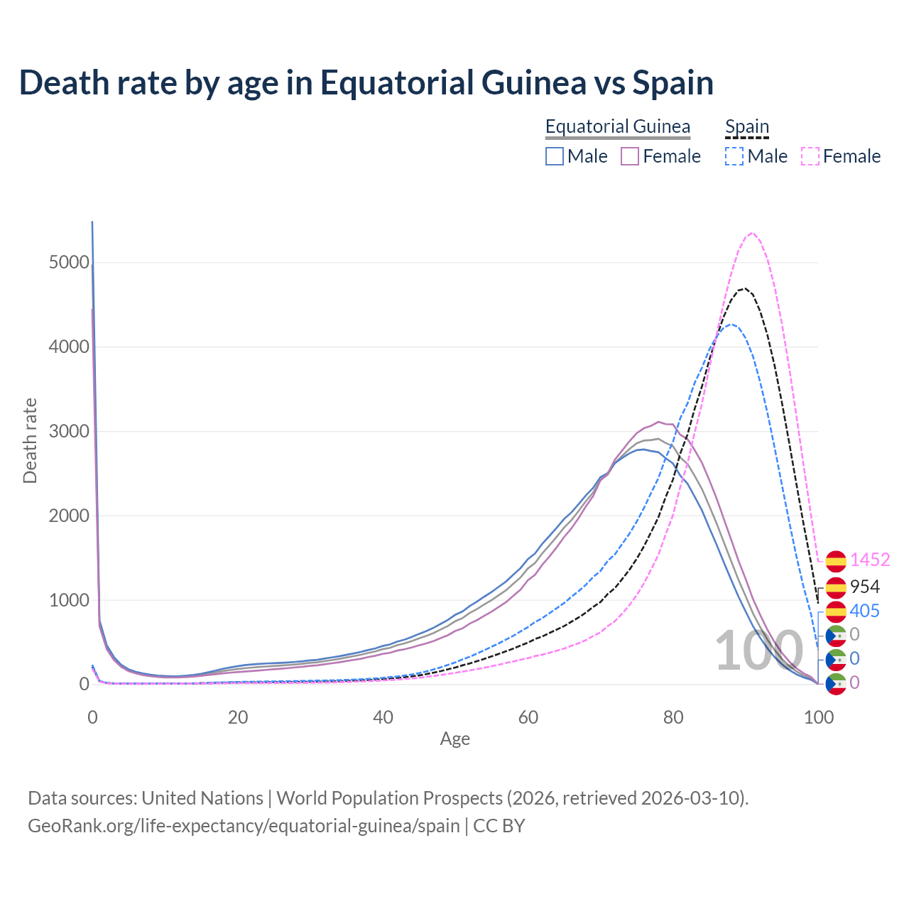 In Equatorial Guinea, the most common age of death is 0, compared to 90 in Spain. The median age of death is 71.3 in Equatorial Guinea and 87 in Spain, meaning only half of each cohort is expected to live past that age.