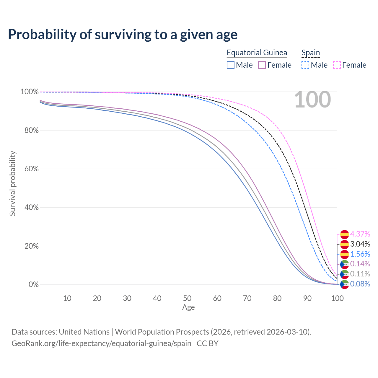 This life expectancy calculator shows the odds of living to 100, 95, 90, and below based on current age for both males and females in Equatorial Guinea and Spain, along with mean and median age of death. The calculations are based on the 2026 life tables (actuarial tables) from the UN World Population Prospects.