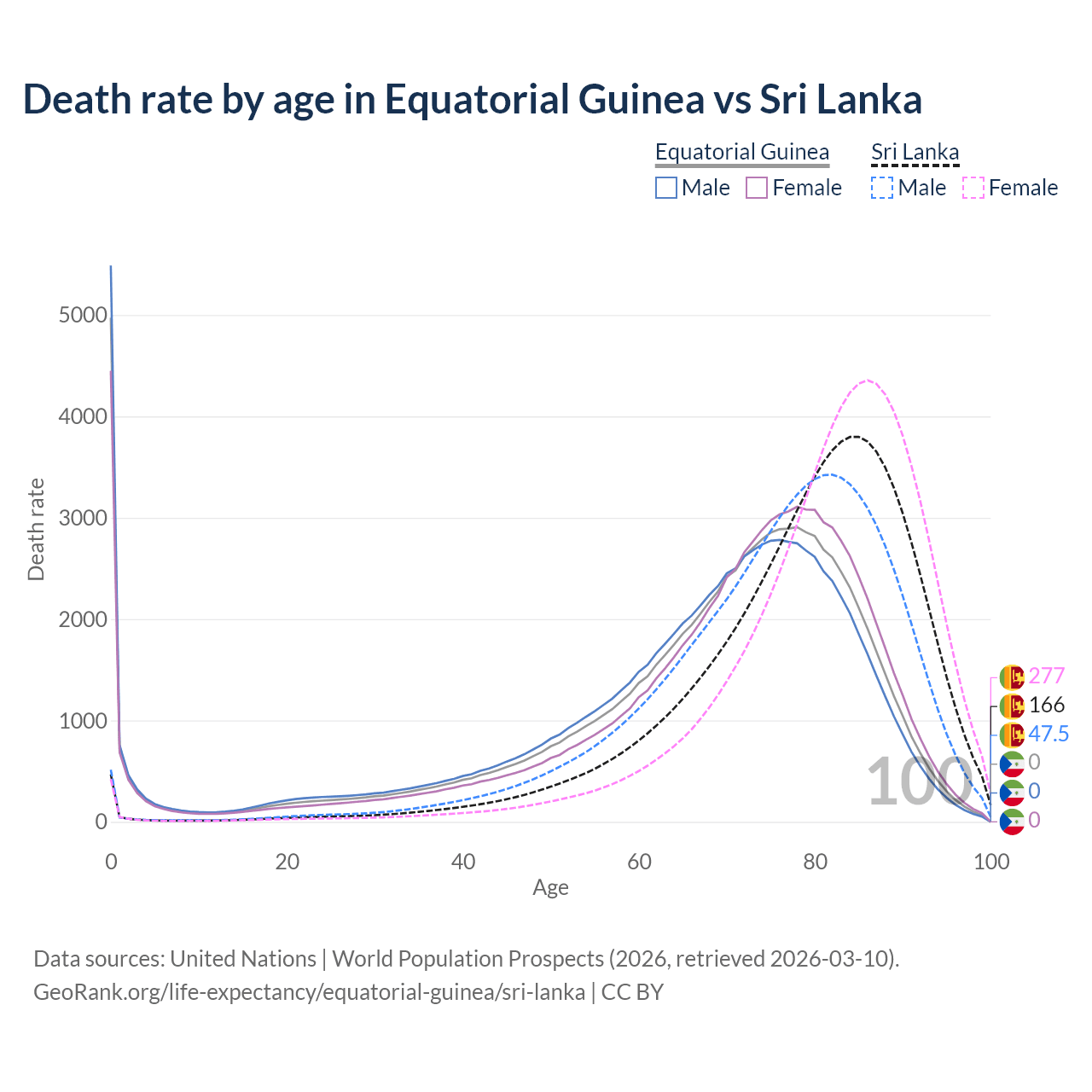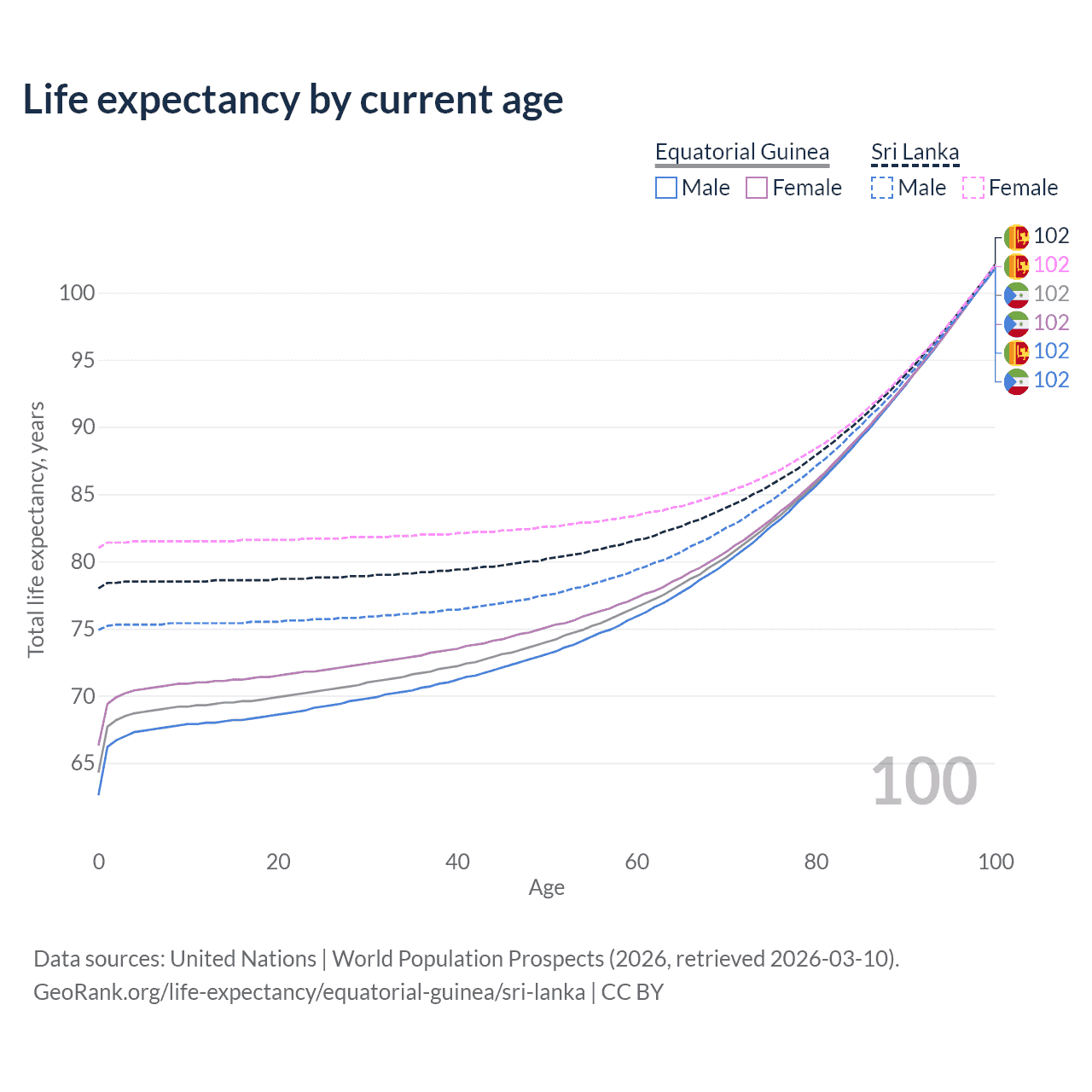 This life expectancy calculator shows the odds of living to 100, 95, 90, and below based on current age for both males and females in Equatorial Guinea and Sri Lanka, along with mean and median age of death. The calculations are based on the 2026 life tables (actuarial tables) from the UN World Population Prospects.