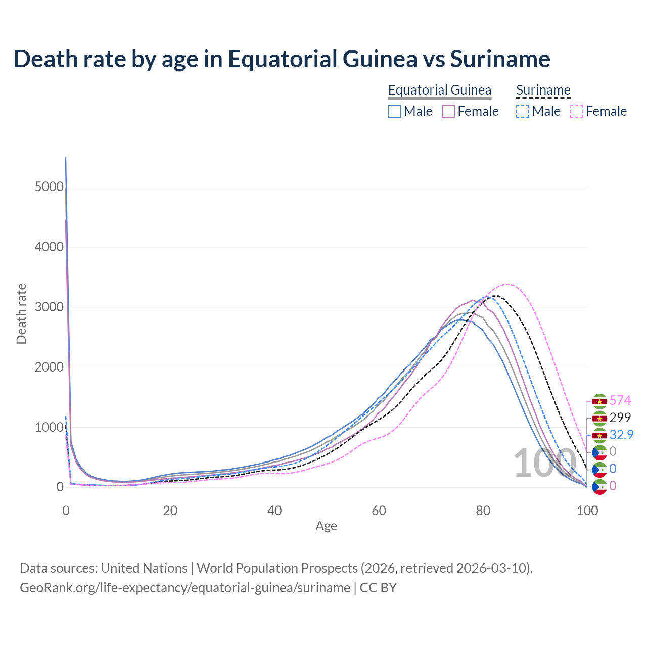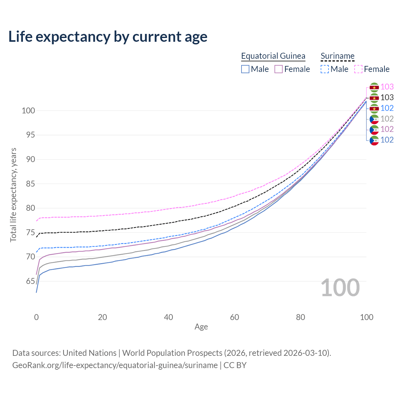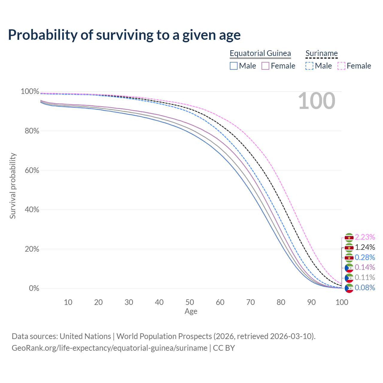 This life expectancy calculator shows the odds of living to 100, 95, 90, and below based on current age for both males and females in Equatorial Guinea and Suriname, along with mean and median age of death. The calculations are based on the 2026 life tables (actuarial tables) from the UN World Population Prospects.