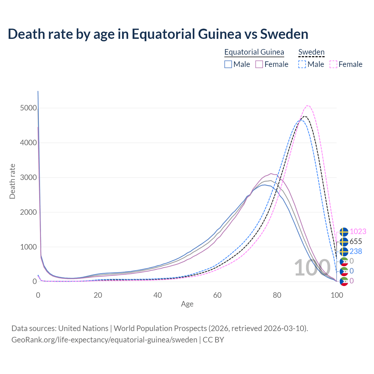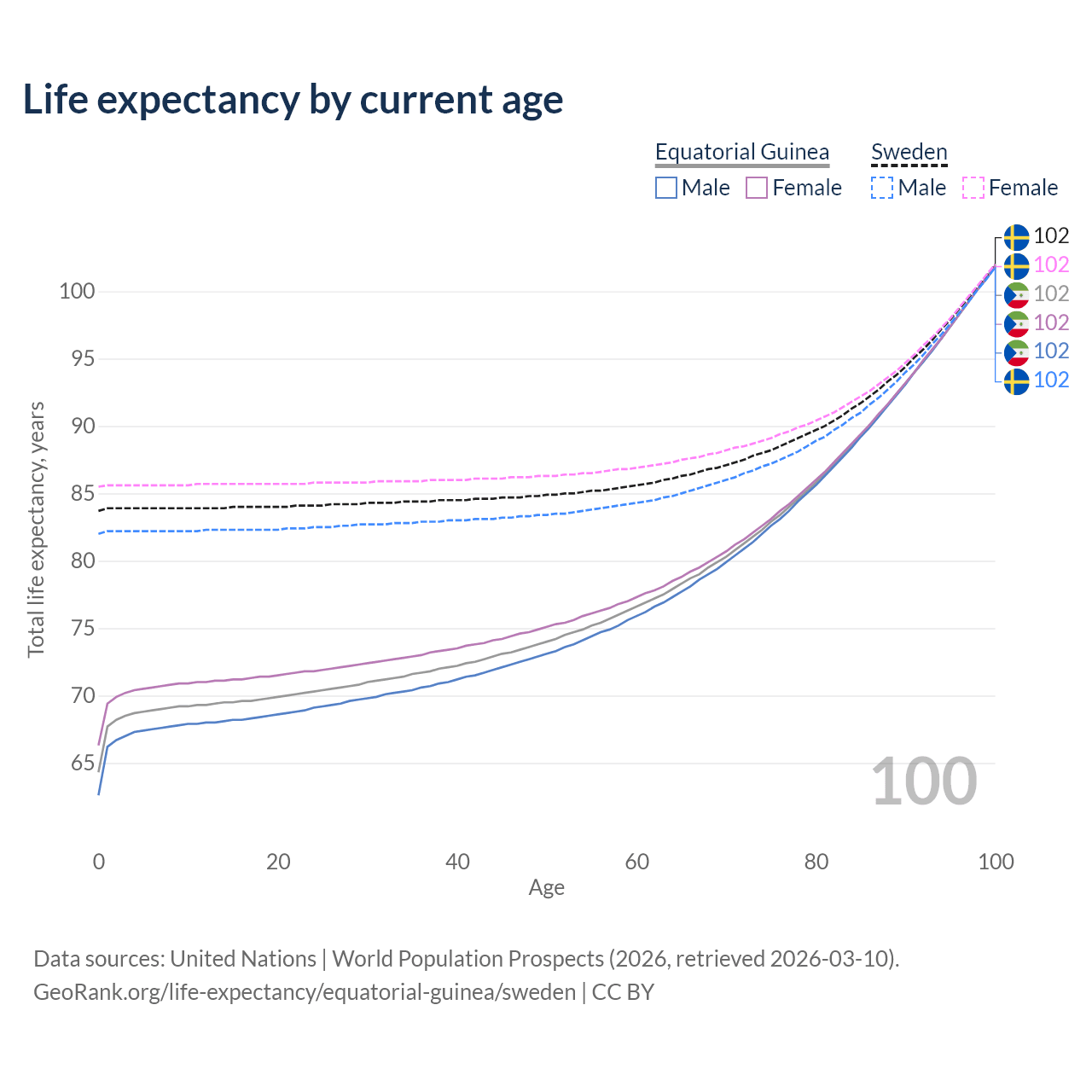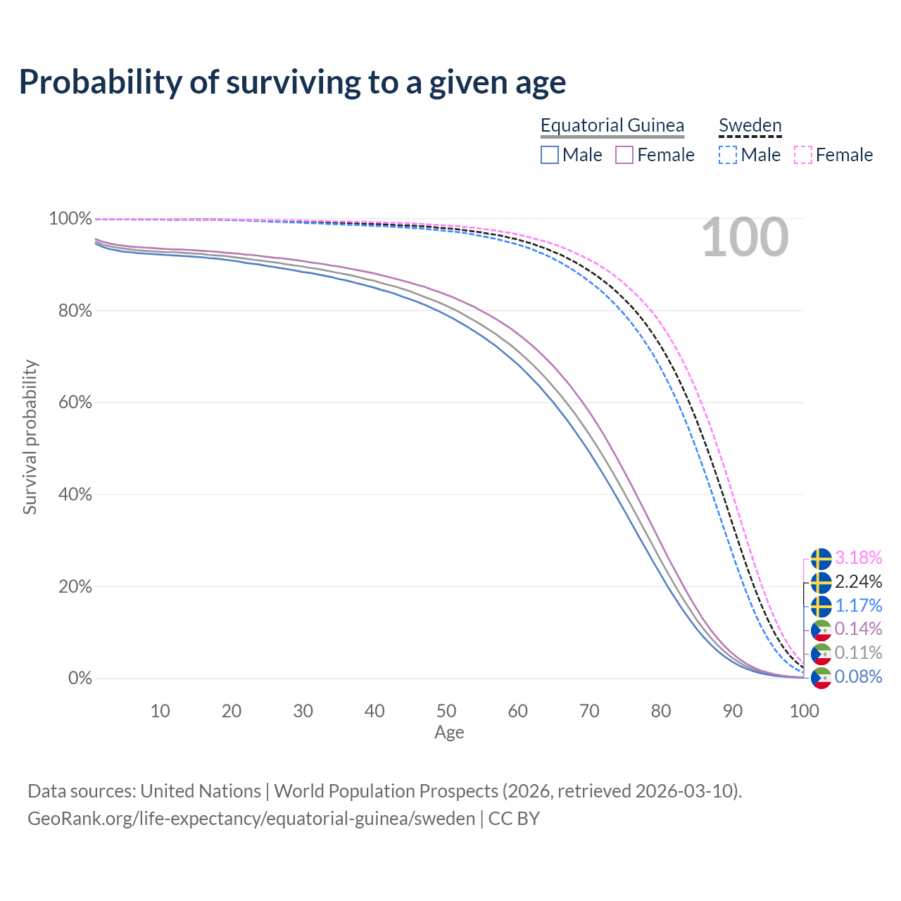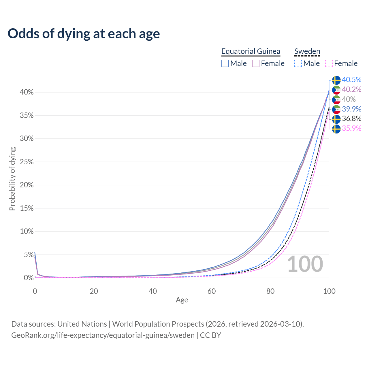 This life expectancy calculator shows the odds of living to 100, 95, 90, and below based on current age for both males and females in Equatorial Guinea and Sweden, along with mean and median age of death. The calculations are based on the 2026 life tables (actuarial tables) from the UN World Population Prospects.