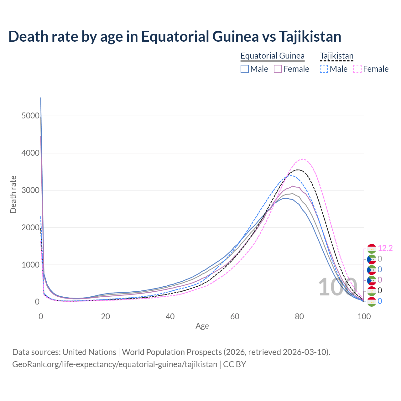 In Equatorial Guinea, the most common age of death is 0, compared to 80 in Tajikistan. The median age of death is 71.3 in Equatorial Guinea and 76 in Tajikistan, meaning only half of each cohort is expected to live past that age.