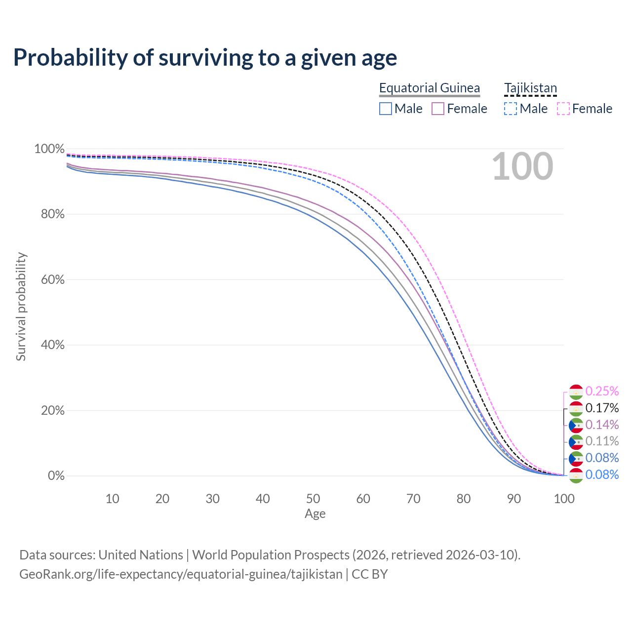 This life expectancy calculator shows the odds of living to 100, 95, 90, and below based on current age for both males and females in Equatorial Guinea and Tajikistan, along with mean and median age of death. The calculations are based on the 2026 life tables (actuarial tables) from the UN World Population Prospects.