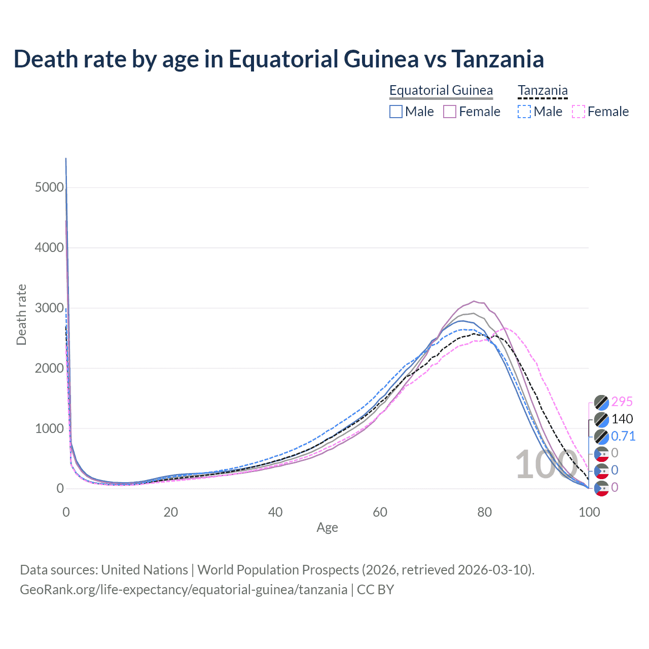 In Equatorial Guinea, the most common age of death is 0, compared to 0 in Tanzania. The median age of death is 71.3 in Equatorial Guinea and 72.6 in Tanzania, meaning only half of each cohort is expected to live past that age.
