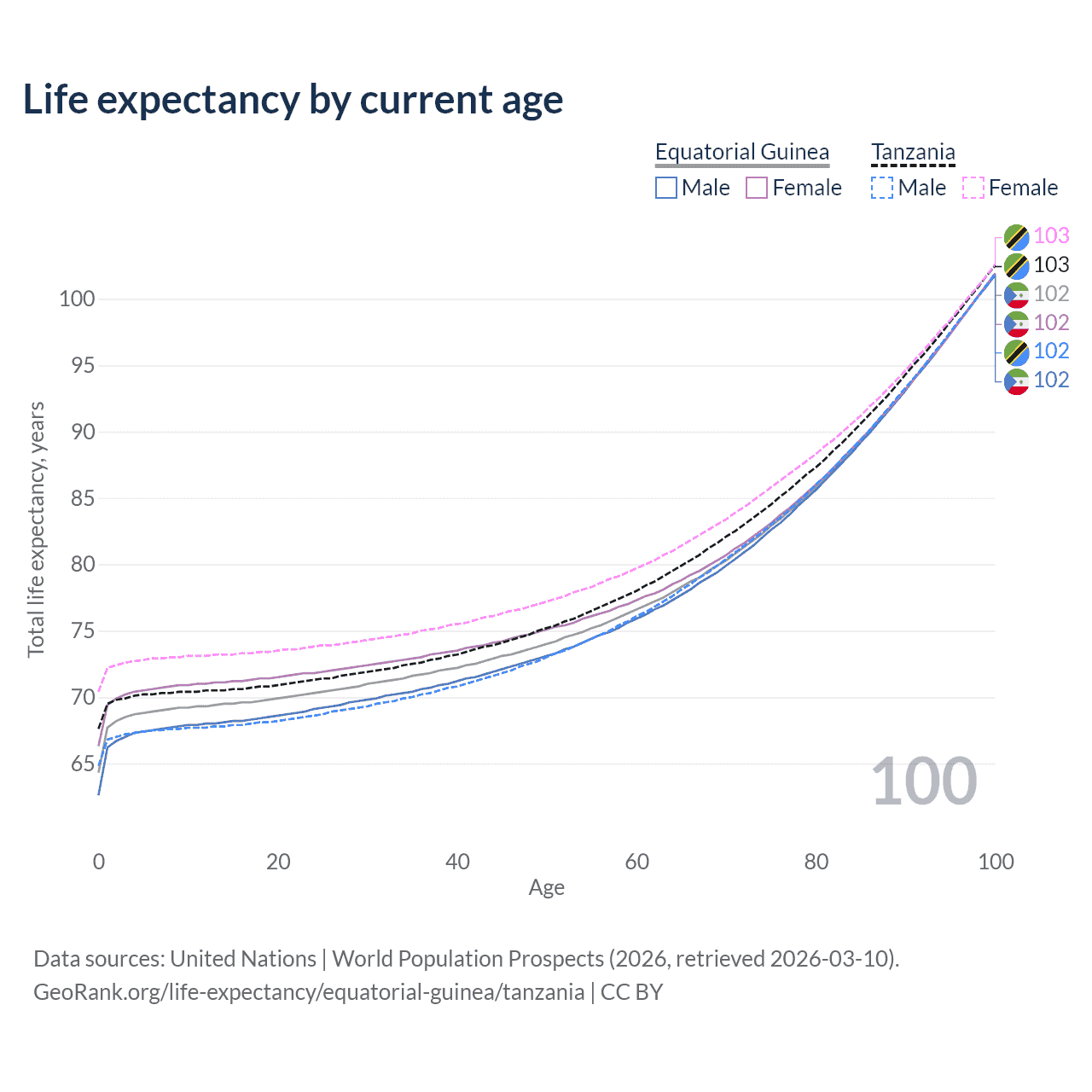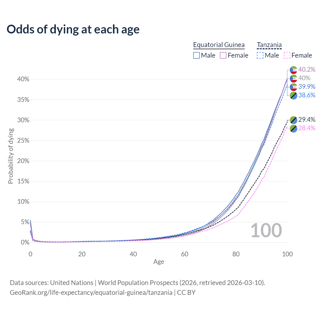 This life expectancy calculator shows the odds of living to 100, 95, 90, and below based on current age for both males and females in Equatorial Guinea and Tanzania, along with mean and median age of death. The calculations are based on the 2026 life tables (actuarial tables) from the UN World Population Prospects.