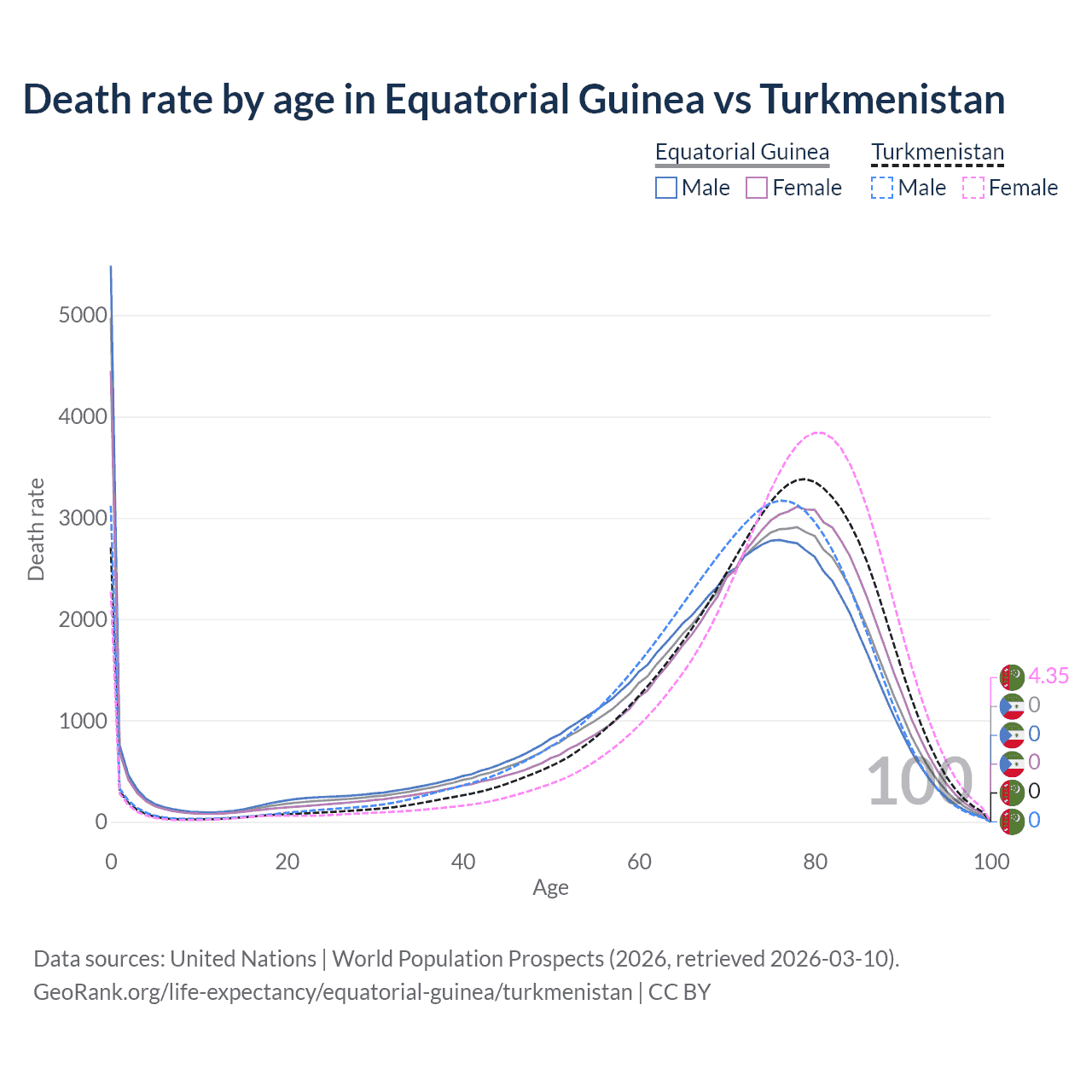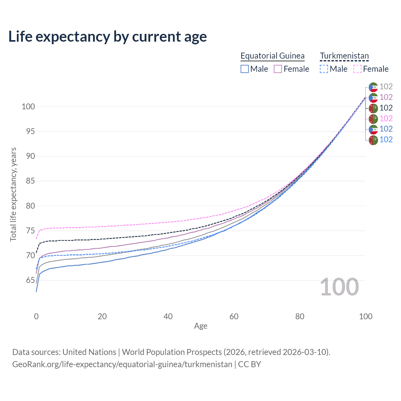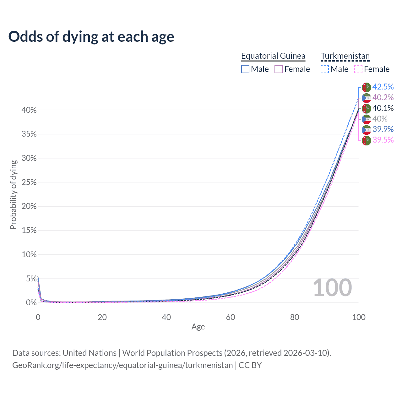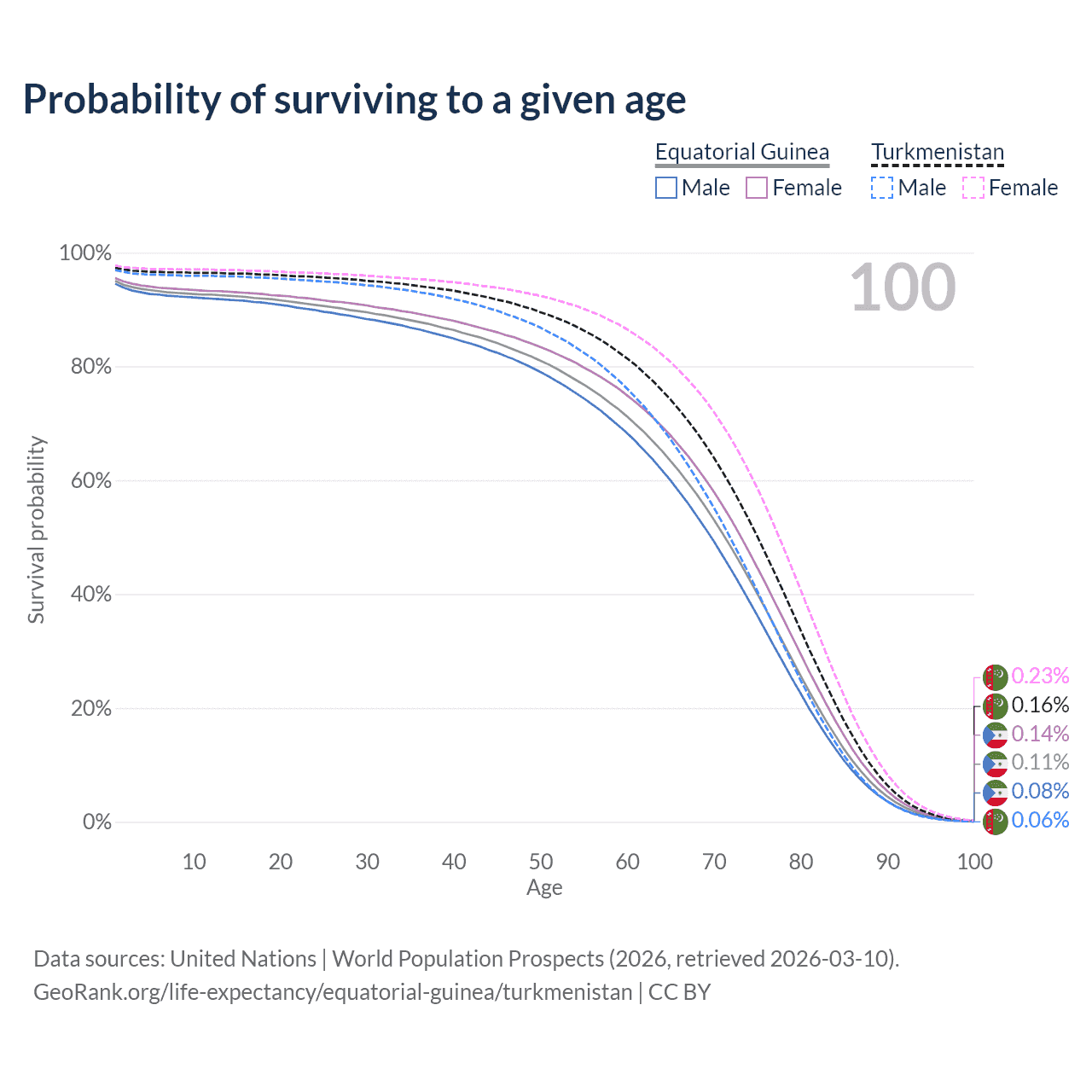 This life expectancy calculator shows the odds of living to 100, 95, 90, and below based on current age for both males and females in Equatorial Guinea and Turkmenistan, along with mean and median age of death. The calculations are based on the 2026 life tables (actuarial tables) from the UN World Population Prospects.