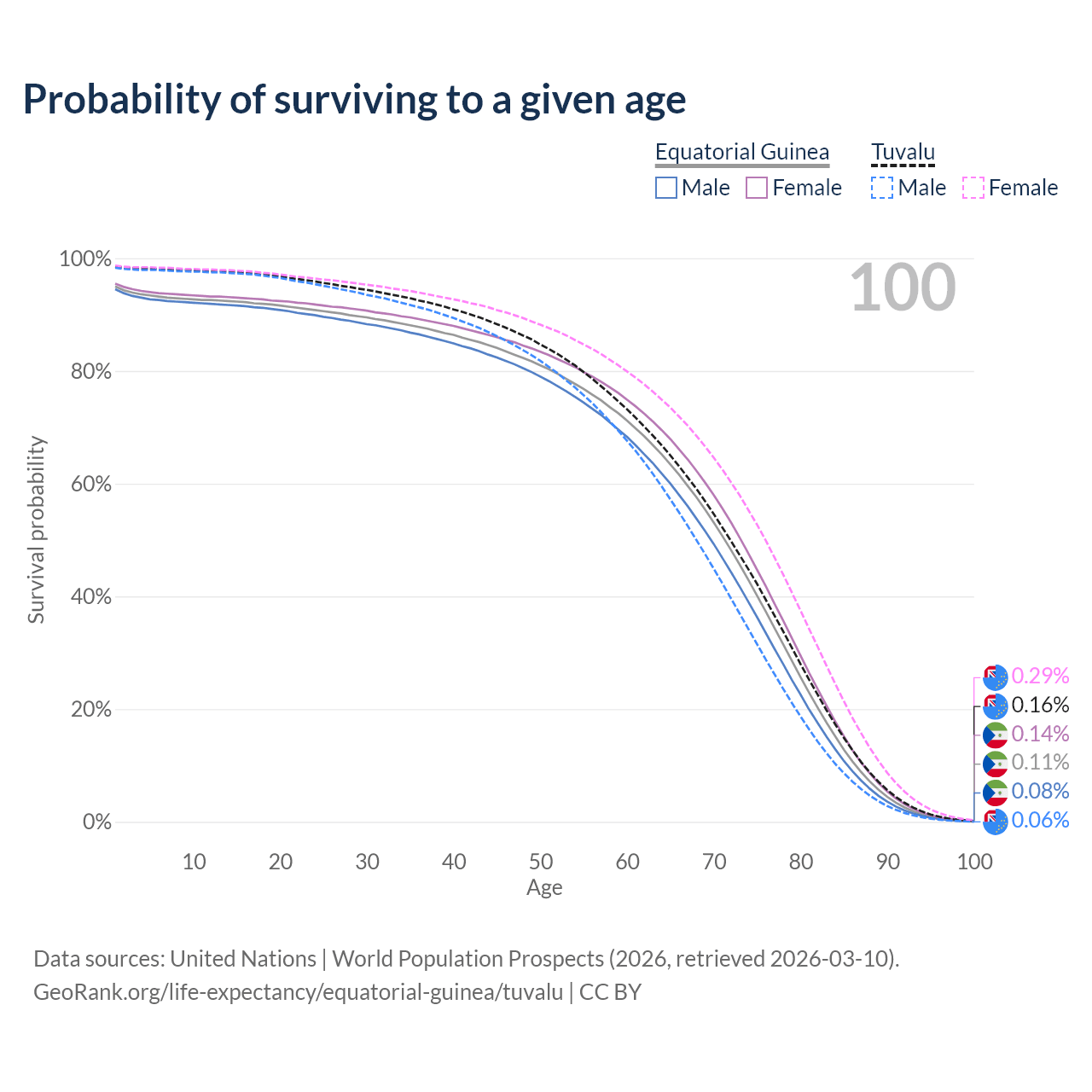 This life expectancy calculator shows the odds of living to 100, 95, 90, and below based on current age for both males and females in Equatorial Guinea and Tuvalu, along with mean and median age of death. The calculations are based on the 2026 life tables (actuarial tables) from the UN World Population Prospects.