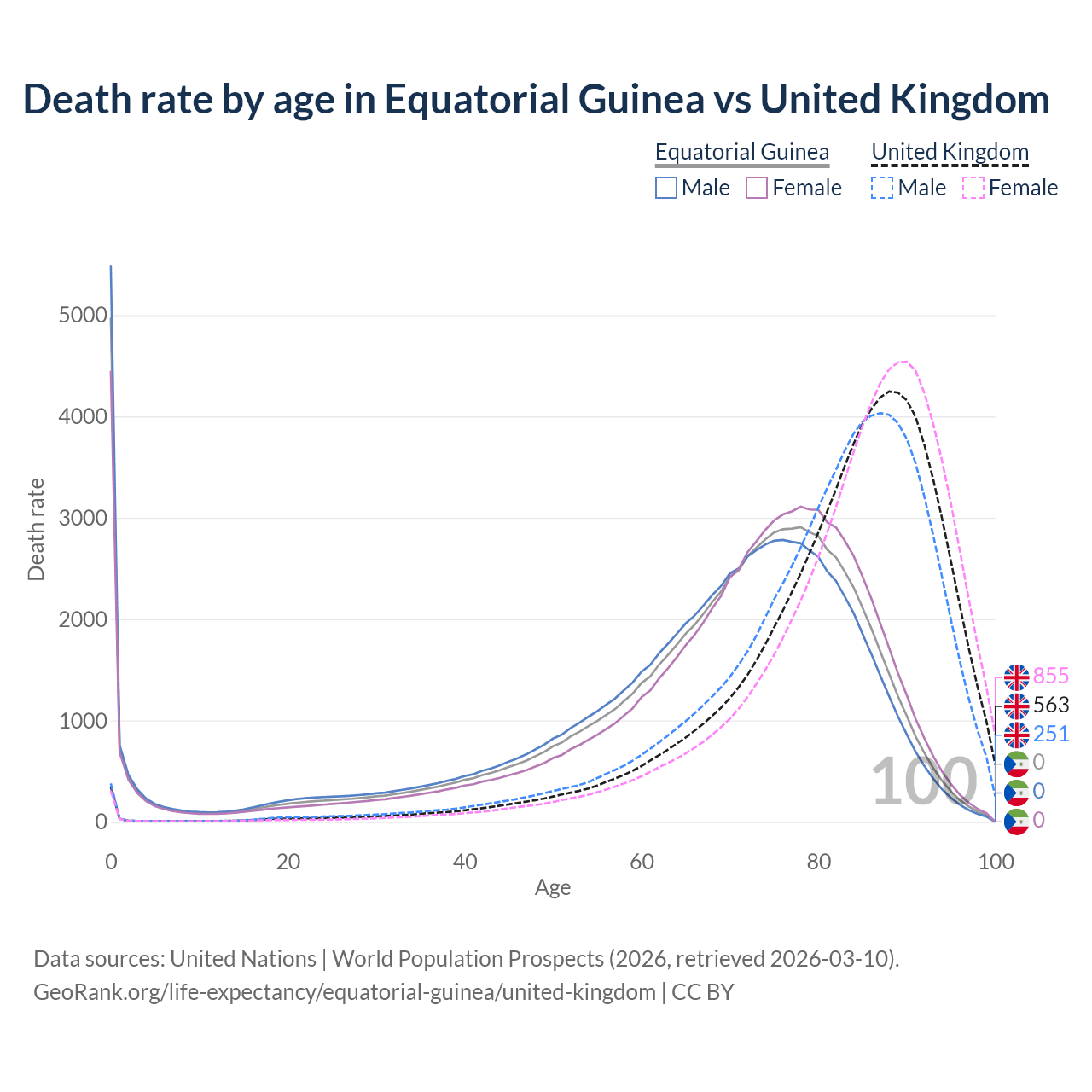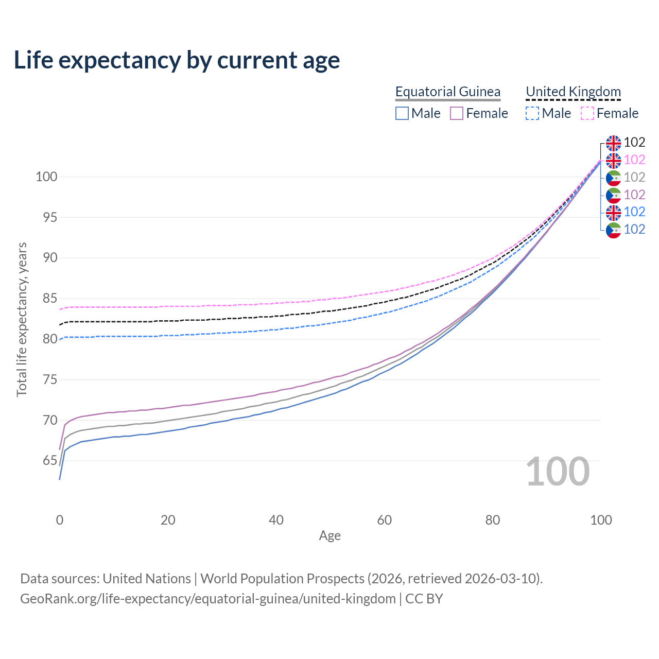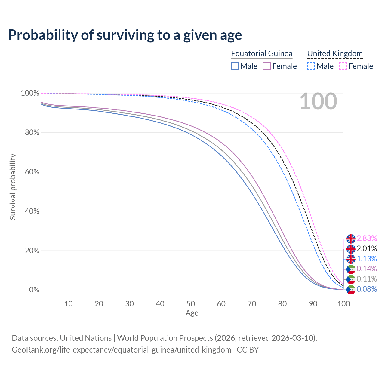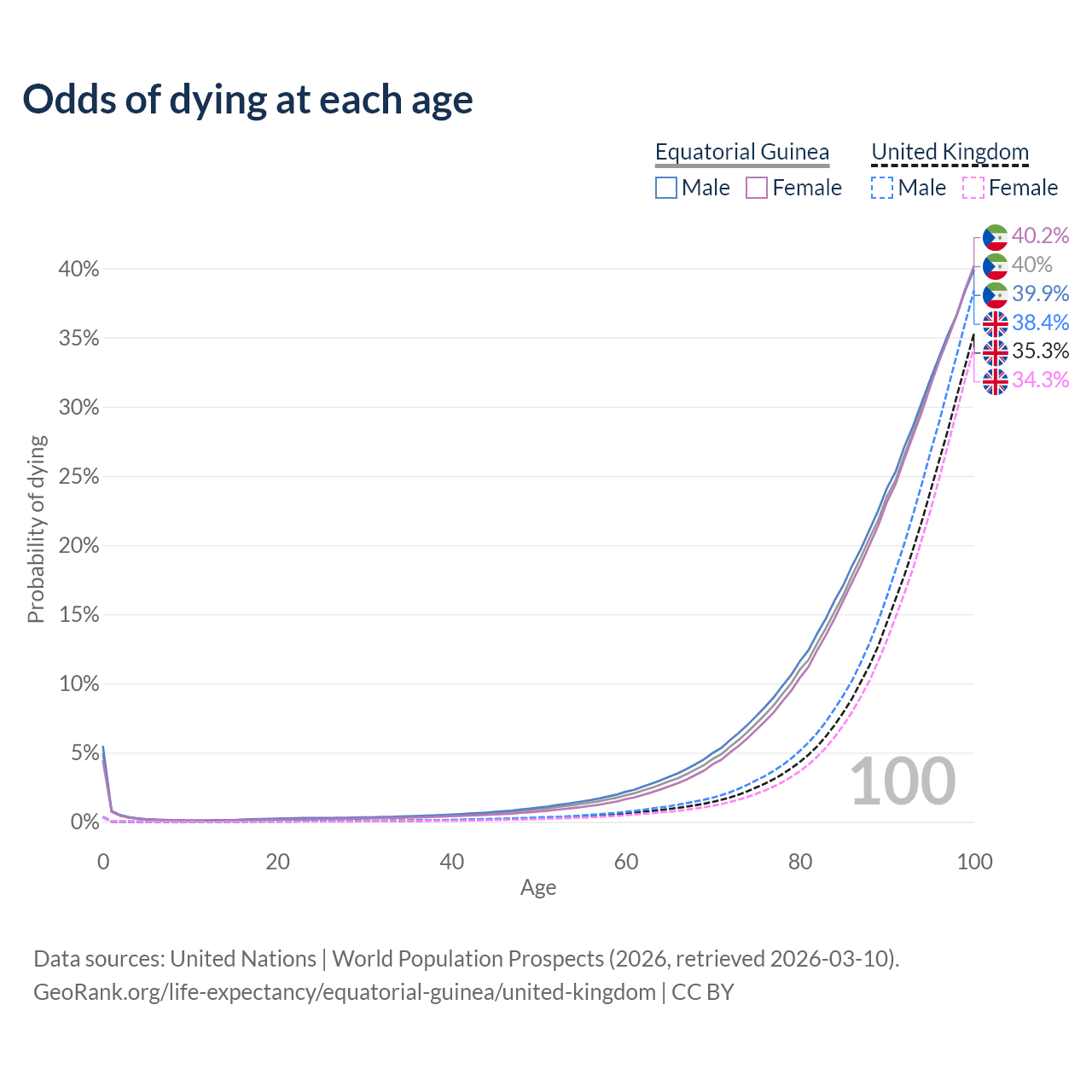 This life expectancy calculator shows the odds of living to 100, 95, 90, and below based on current age for both males and females in Equatorial Guinea and the United Kingdom, along with mean and median age of death. The calculations are based on the 2026 life tables (actuarial tables) from the UN World Population Prospects.