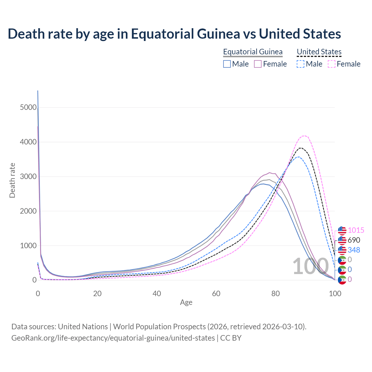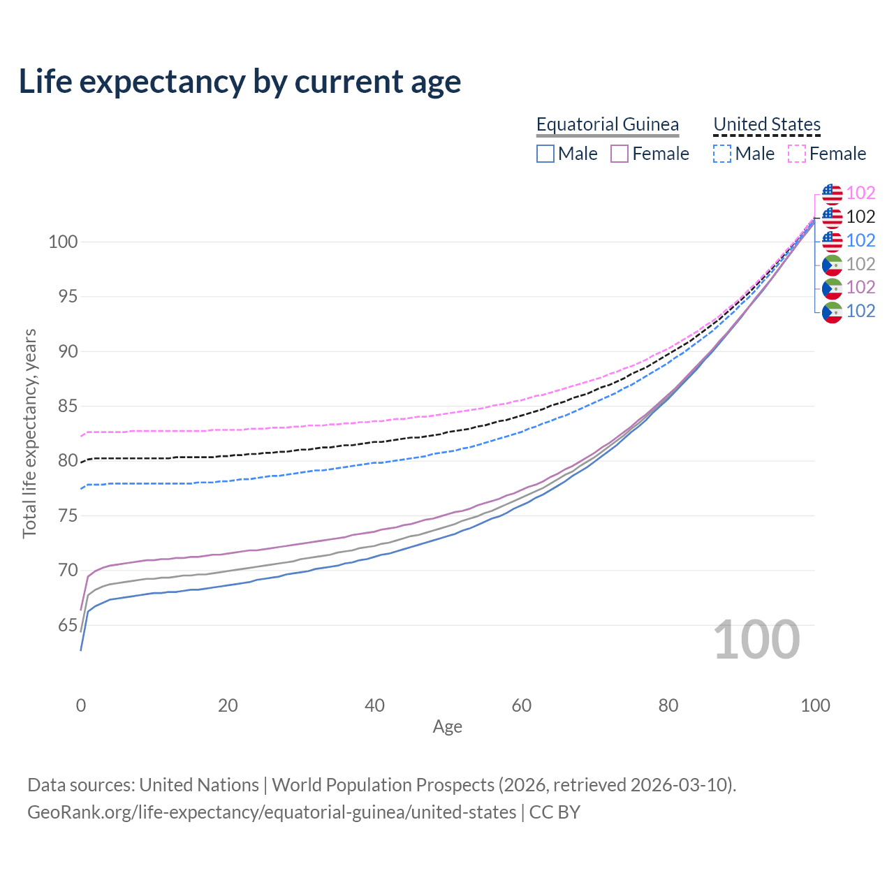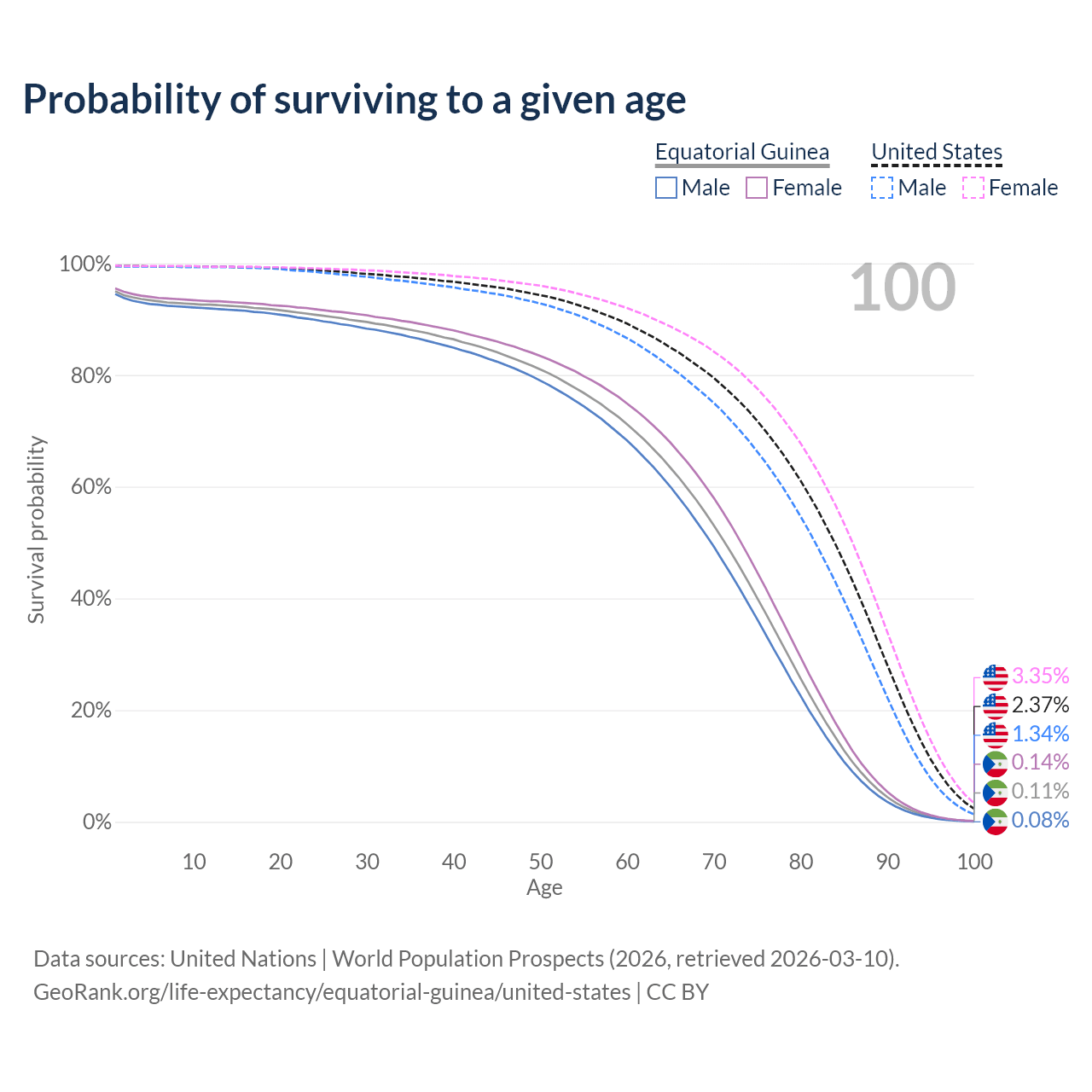 This life expectancy calculator shows the odds of living to 100, 95, 90, and below based on current age for both males and females in Equatorial Guinea and the United States, along with mean and median age of death. The calculations are based on the 2026 life tables (actuarial tables) from the UN World Population Prospects.
