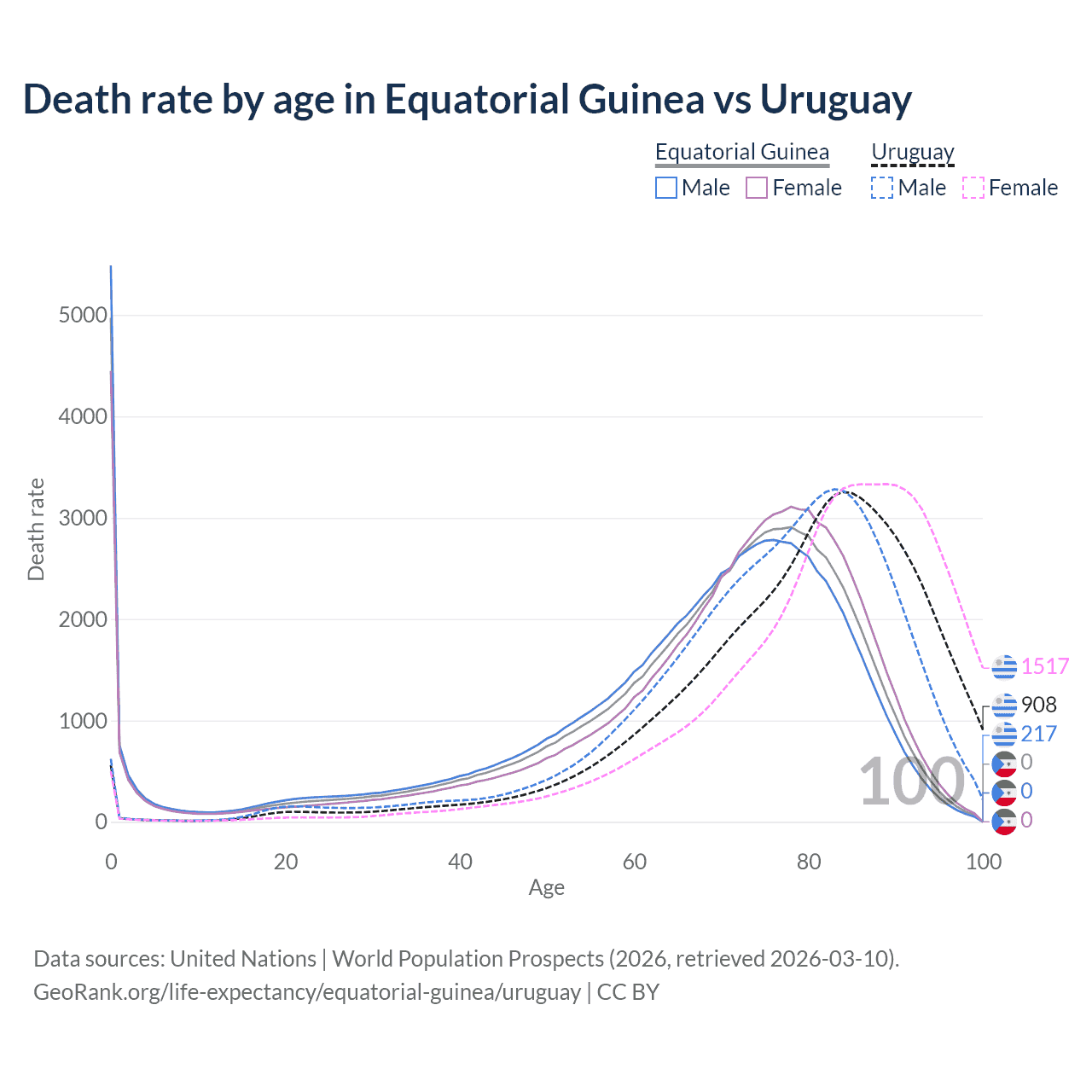 In Equatorial Guinea, the most common age of death is 0, compared to 84 in Uruguay. The median age of death is 71.3 in Equatorial Guinea and 81.8 in Uruguay, meaning only half of each cohort is expected to live past that age.