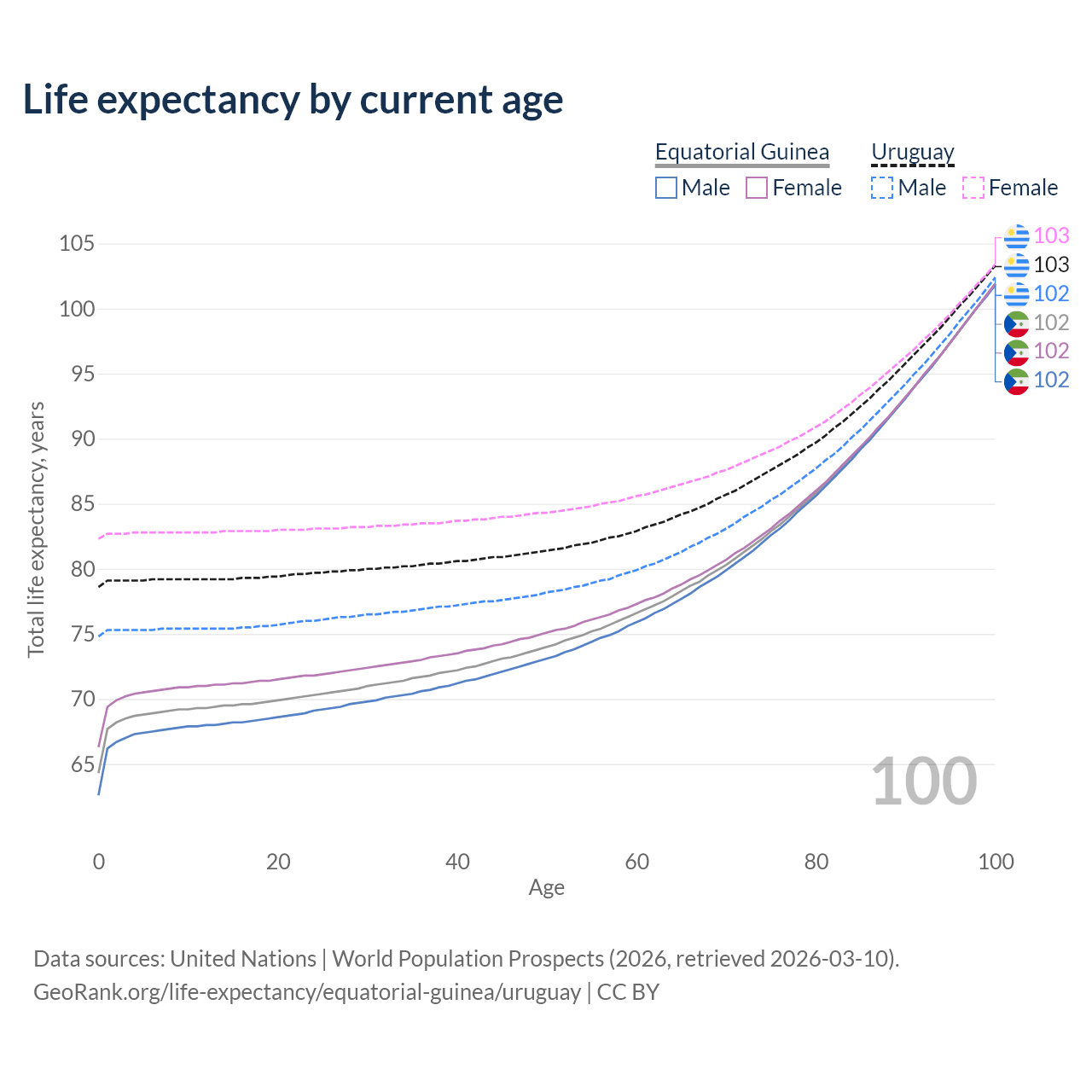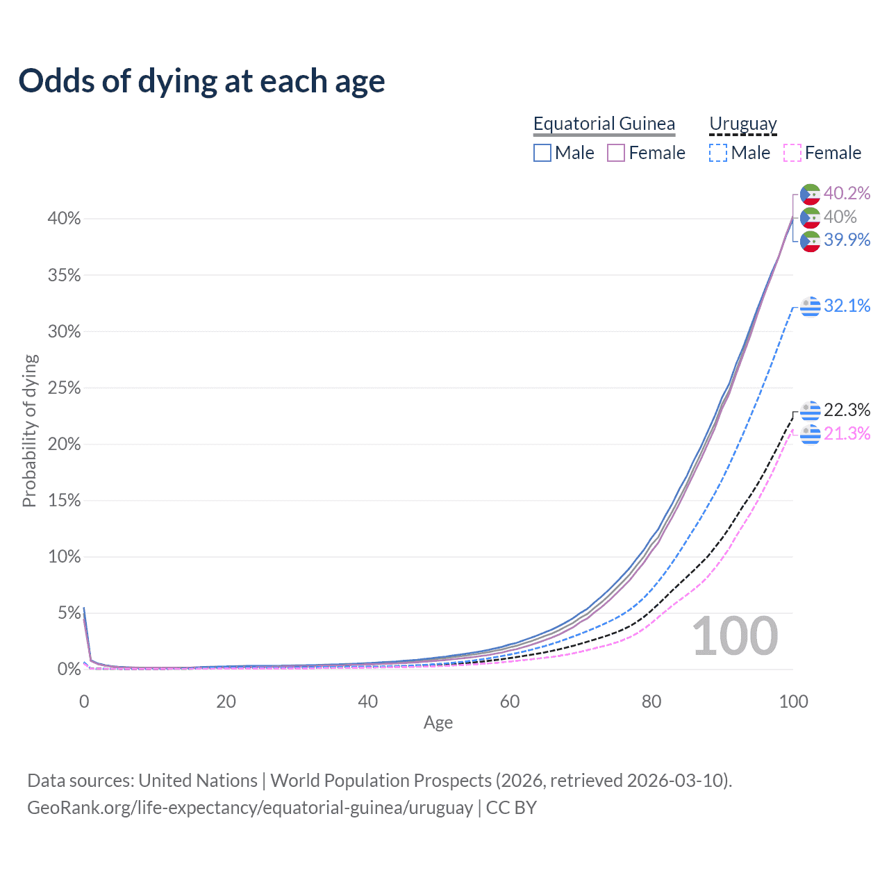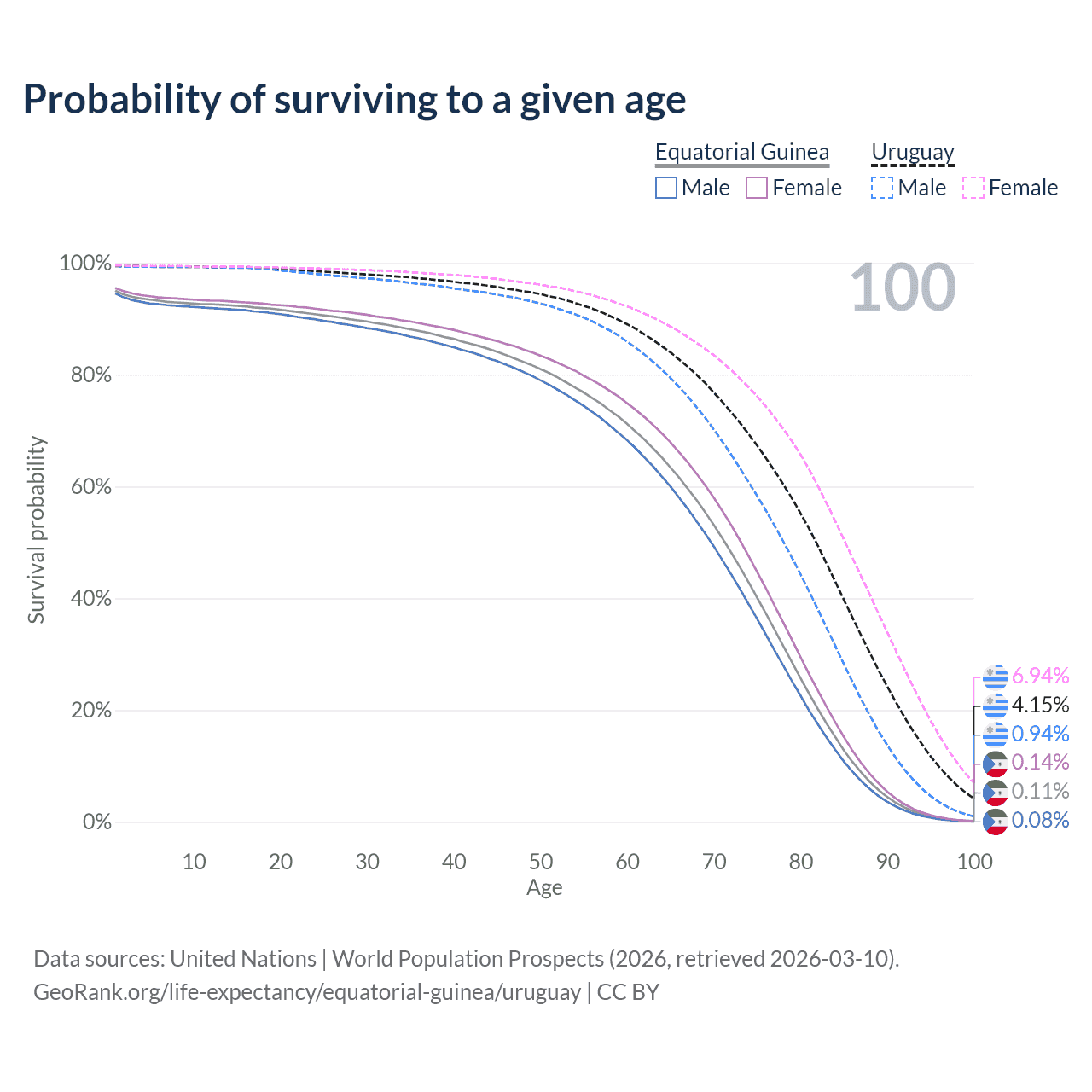 This life expectancy calculator shows the odds of living to 100, 95, 90, and below based on current age for both males and females in Equatorial Guinea and Uruguay, along with mean and median age of death. The calculations are based on the 2026 life tables (actuarial tables) from the UN World Population Prospects.
