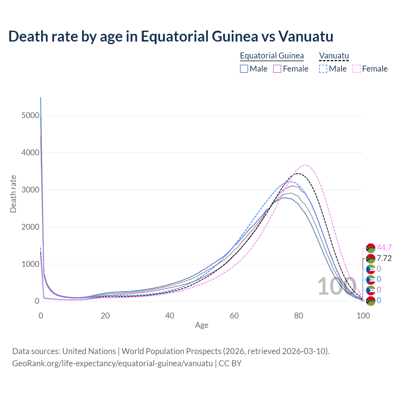 This life expectancy calculator shows the odds of living to 100, 95, 90, and below based on current age for both males and females in Equatorial Guinea and Vanuatu, along with mean and median age of death. The calculations are based on the 2026 life tables (actuarial tables) from the UN World Population Prospects.