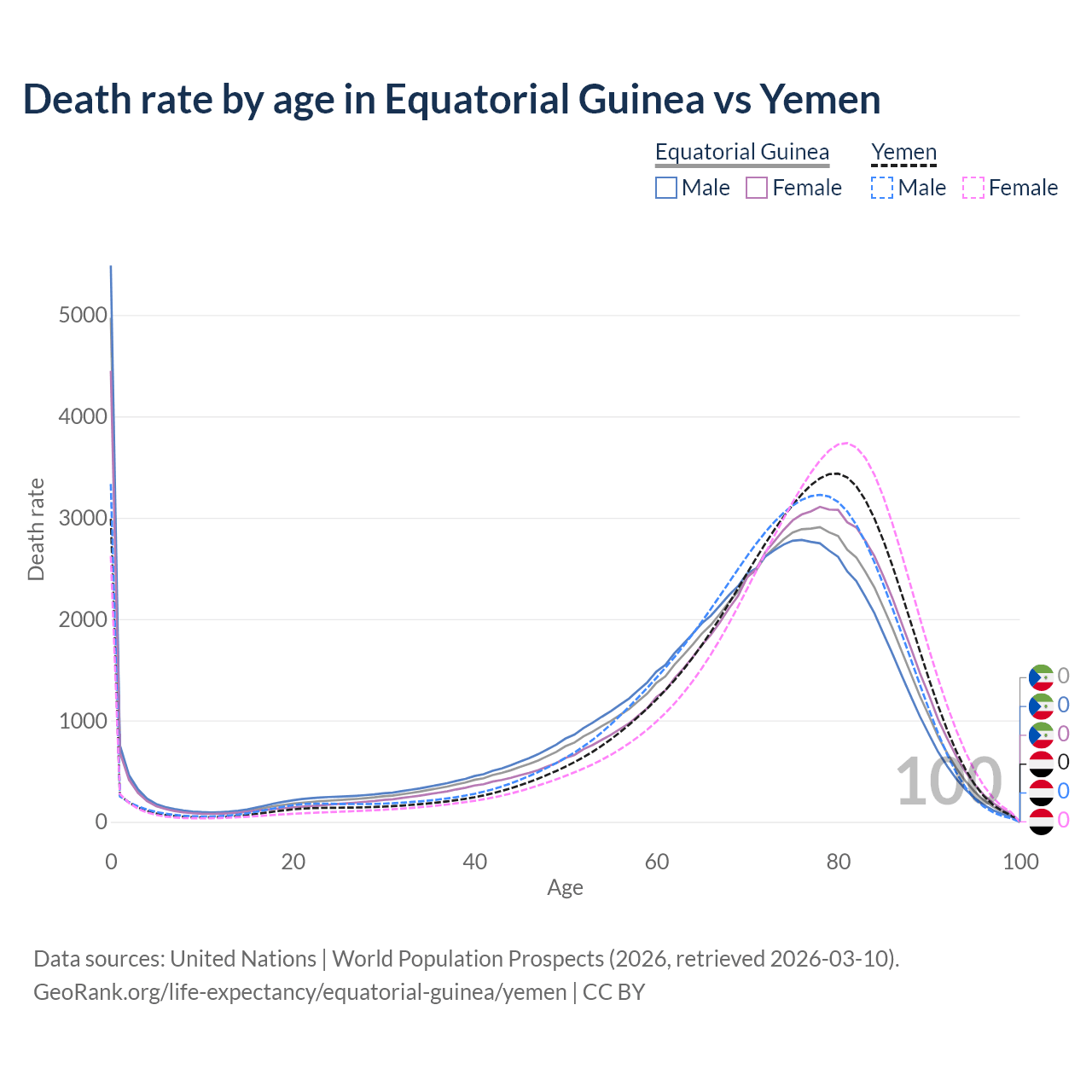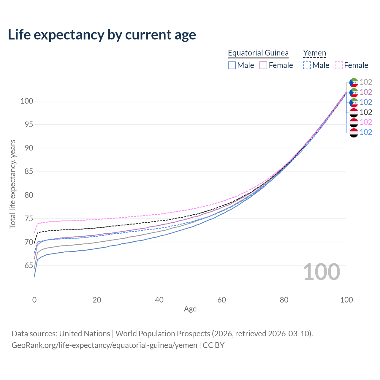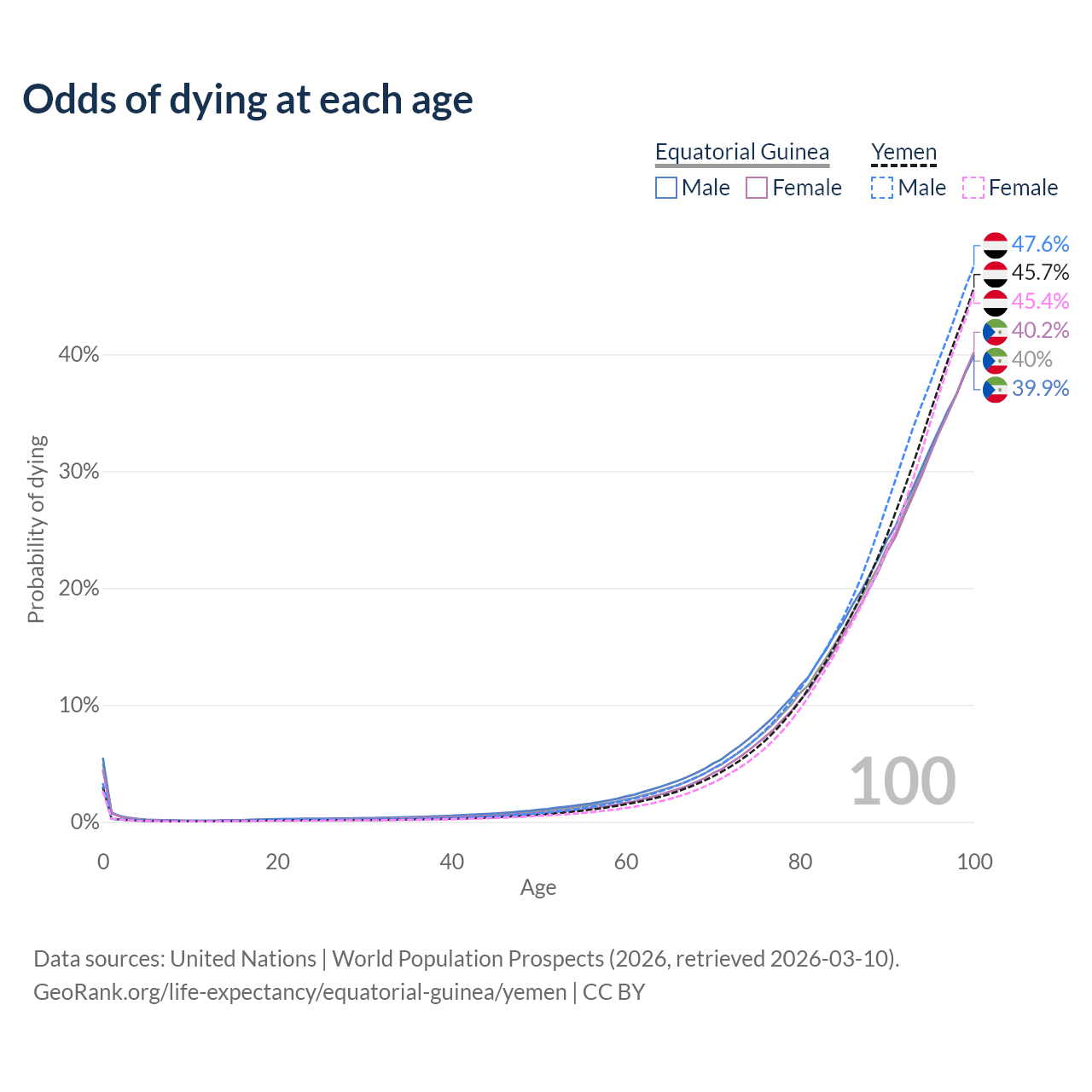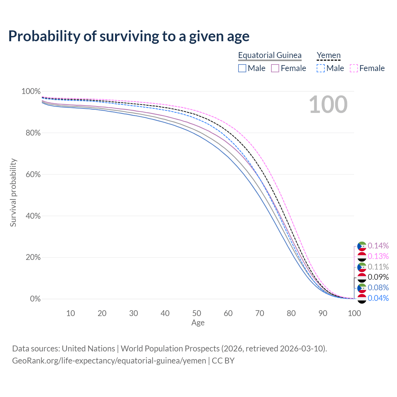 This life expectancy calculator shows the odds of living to 100, 95, 90, and below based on current age for both males and females in Equatorial Guinea and Yemen, along with mean and median age of death. The calculations are based on the 2026 life tables (actuarial tables) from the UN World Population Prospects.