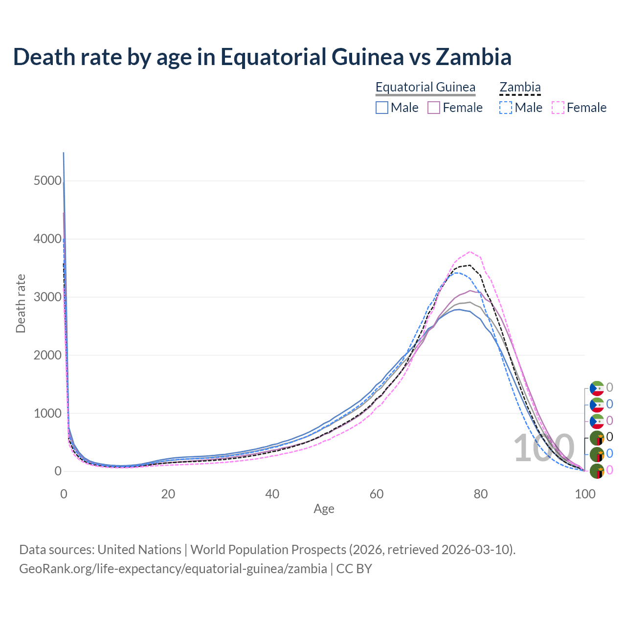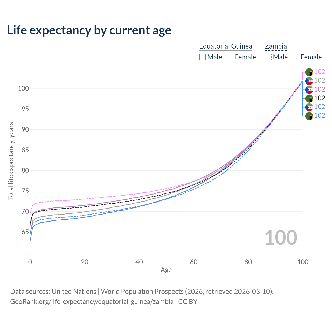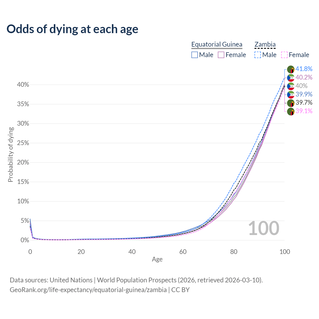 This life expectancy calculator shows the odds of living to 100, 95, 90, and below based on current age for both males and females in Equatorial Guinea and Zambia, along with mean and median age of death. The calculations are based on the 2026 life tables (actuarial tables) from the UN World Population Prospects.