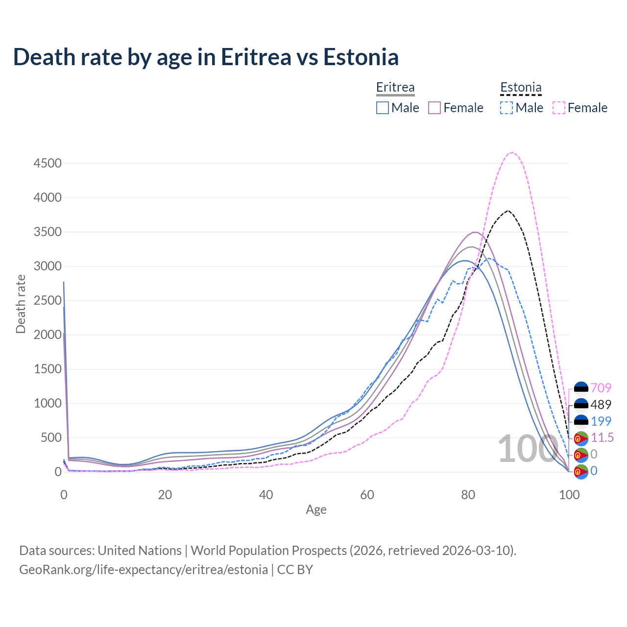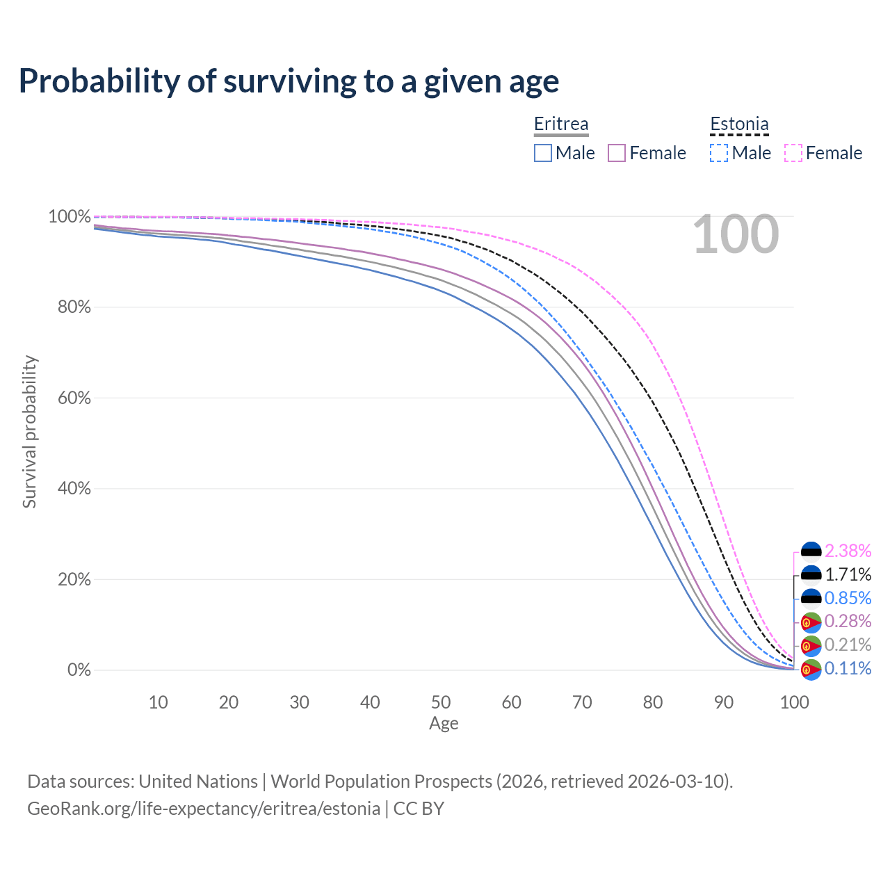 This life expectancy calculator shows the odds of living to 100, 95, 90, and below based on current age for both males and females in Eritrea and Estonia, along with mean and median age of death. The calculations are based on the 2026 life tables (actuarial tables) from the UN World Population Prospects.