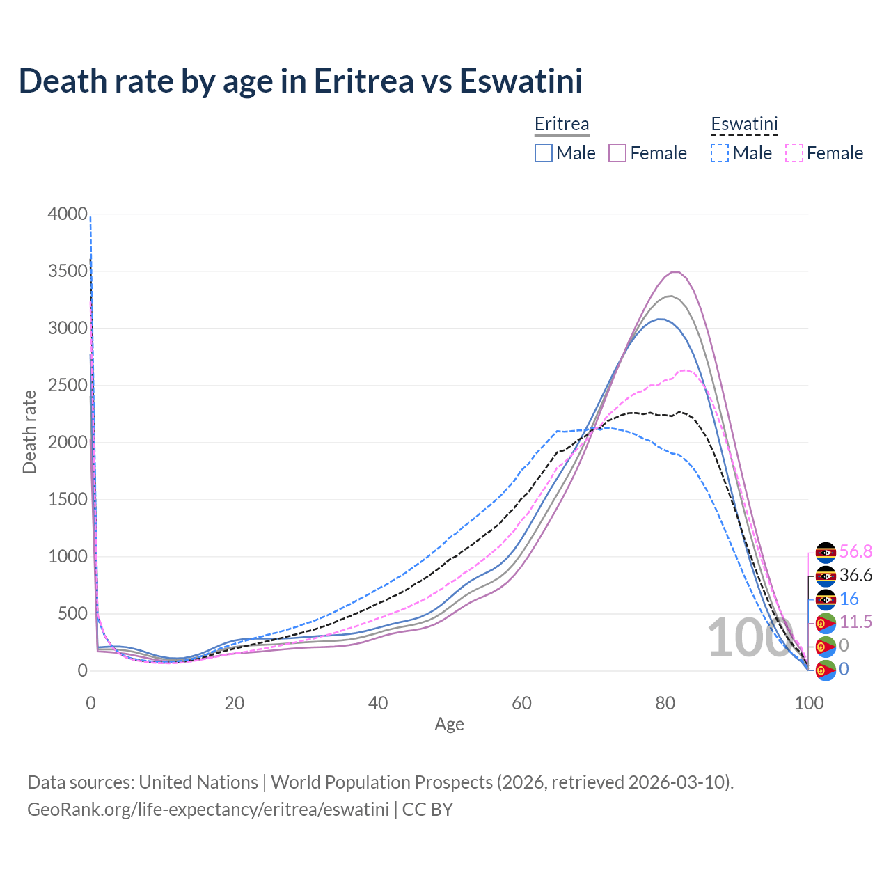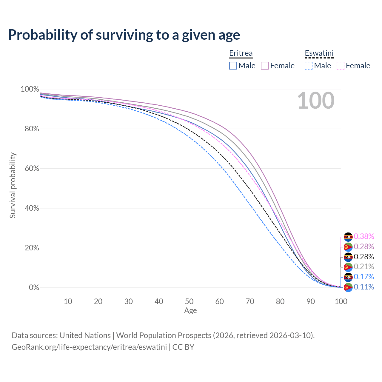 This life expectancy calculator shows the odds of living to 100, 95, 90, and below based on current age for both males and females in Eritrea and Eswatini, along with mean and median age of death. The calculations are based on the 2026 life tables (actuarial tables) from the UN World Population Prospects.