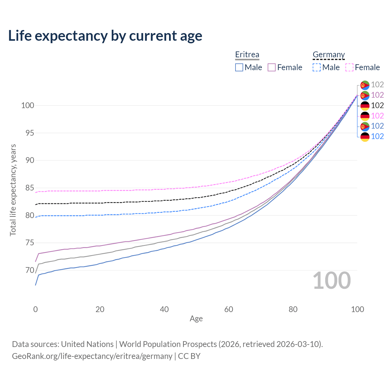 This life expectancy calculator shows the odds of living to 100, 95, 90, and below based on current age for both males and females in Eritrea and Germany, along with mean and median age of death. The calculations are based on the 2026 life tables (actuarial tables) from the UN World Population Prospects.