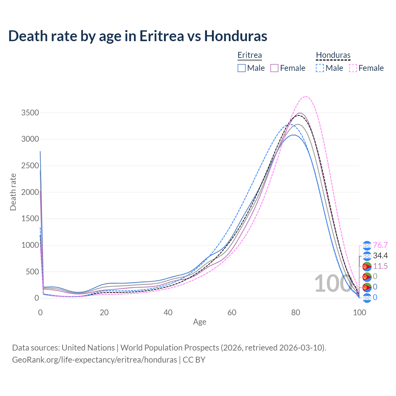 In Eritrea, the most common age of death is 81, compared to 81 in Honduras. The median age of death is 75.5 in Eritrea and 77.1 in Honduras, meaning only half of each cohort is expected to live past that age.