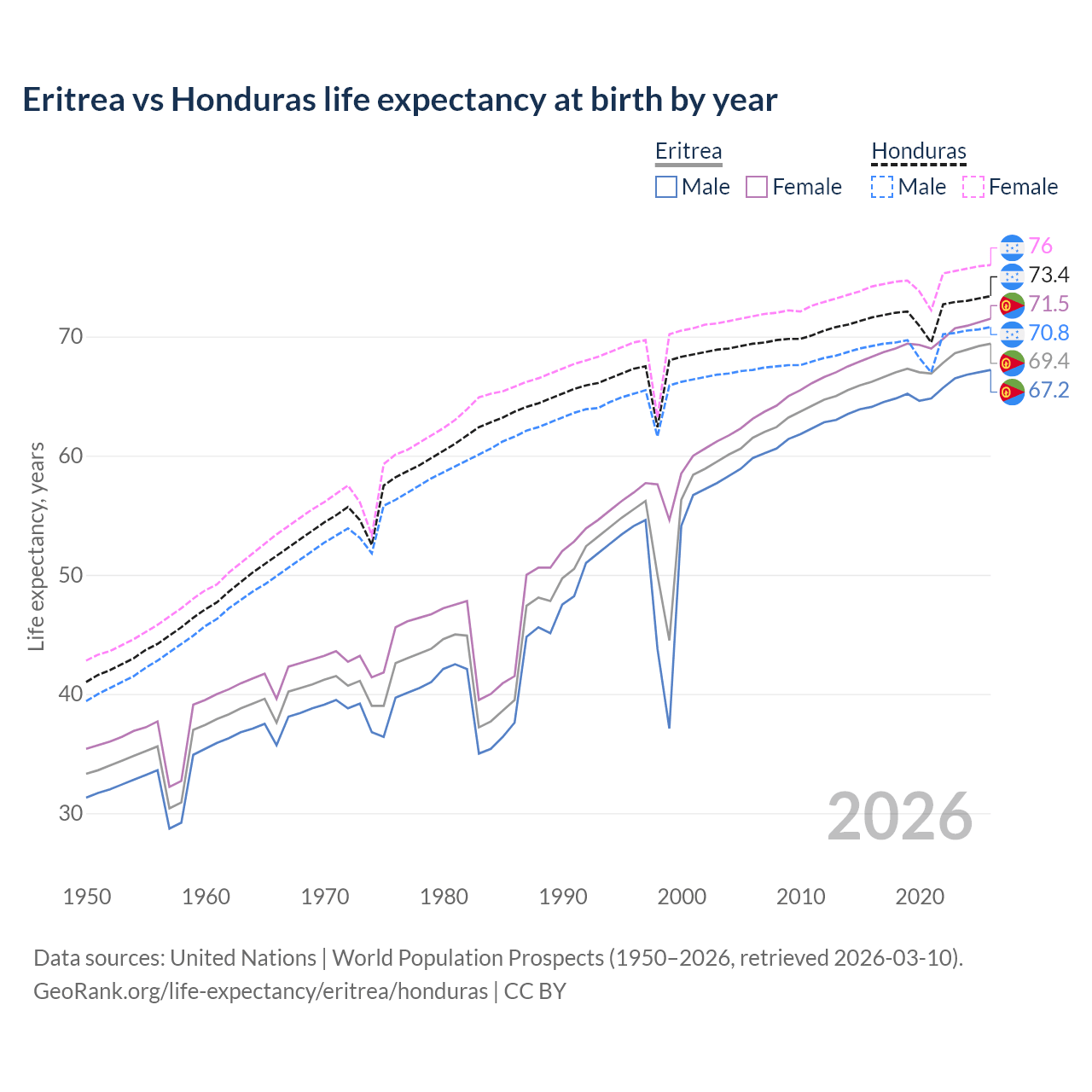 The average life expectancy at birth is 69.4 years in Eritrea vs 73.4 in Honduras. Eritrea is ranked 142/197 by life expectancy, and Honduras is 110/197. In Eritrea, the life expectancy is 67.2 years for males and 71.5 years for females. In Honduras, it's 70.8 years for males and 76 years for females.