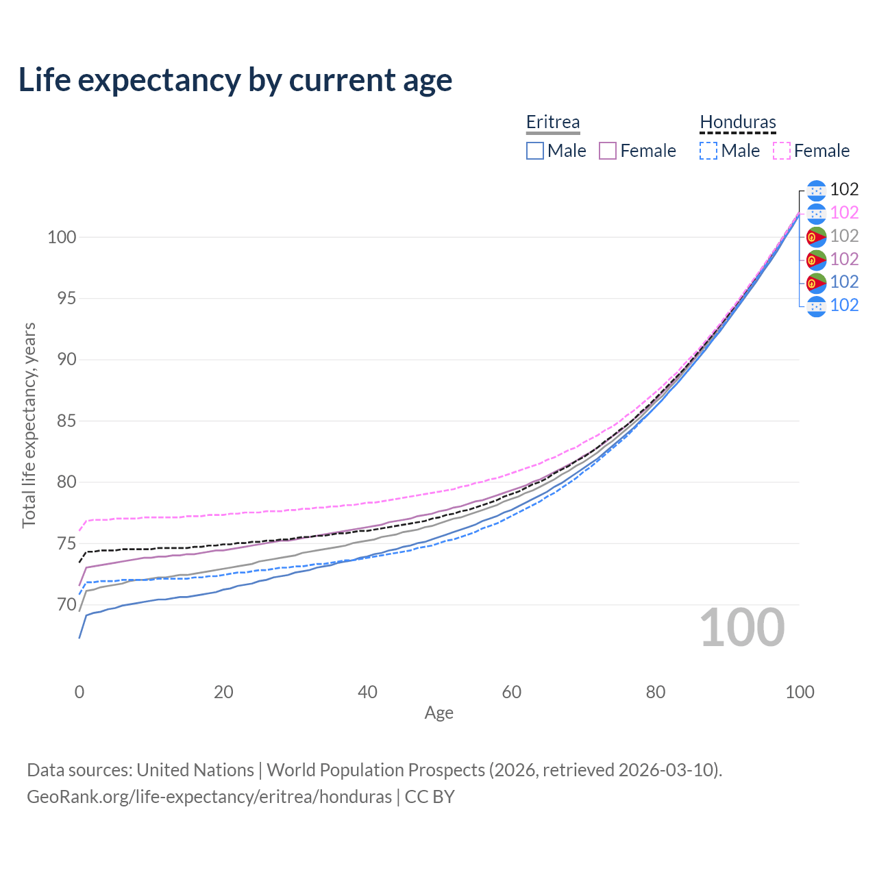 This life expectancy calculator shows the odds of living to 100, 95, 90, and below based on current age for both males and females in Eritrea and Honduras, along with mean and median age of death. The calculations are based on the 2026 life tables (actuarial tables) from the UN World Population Prospects.