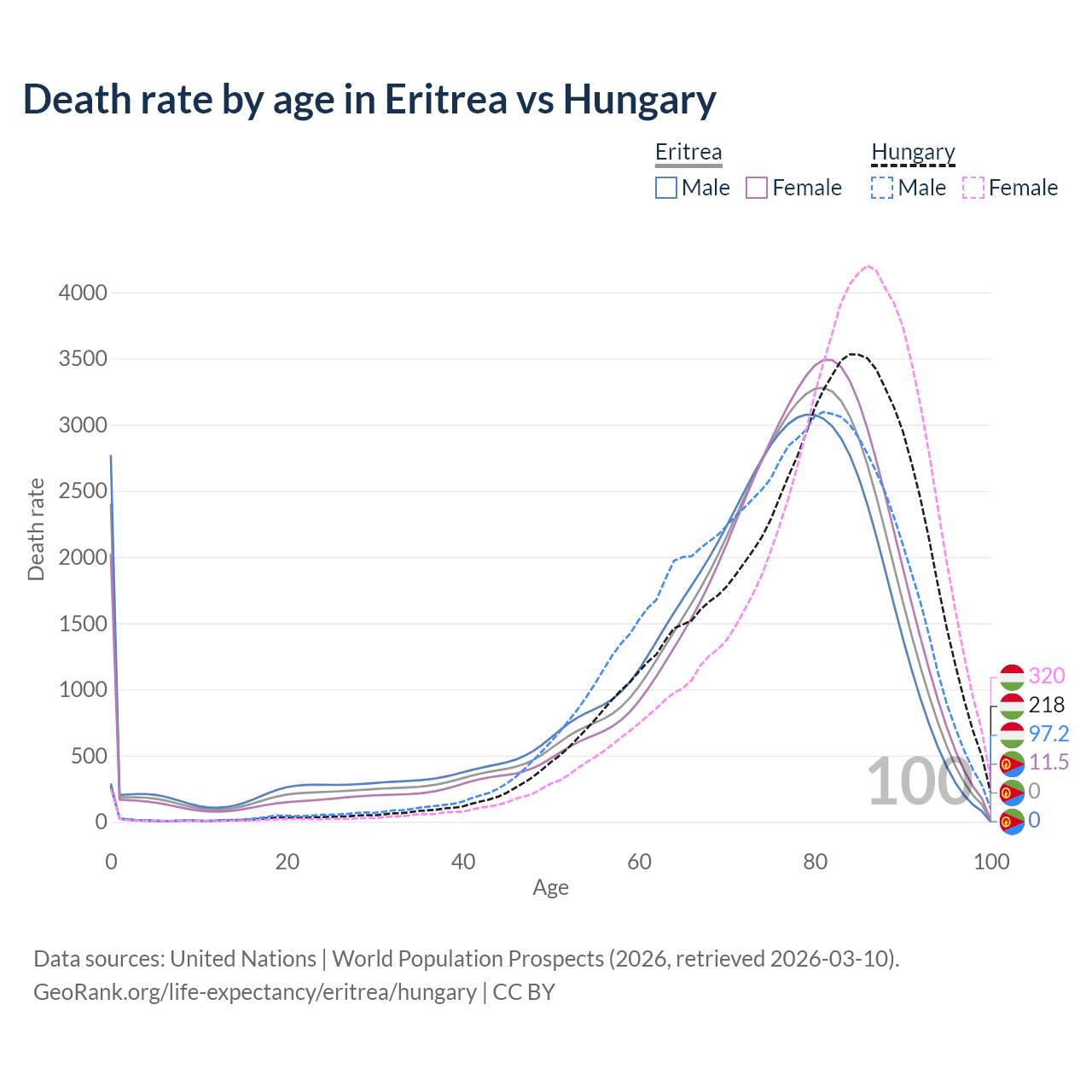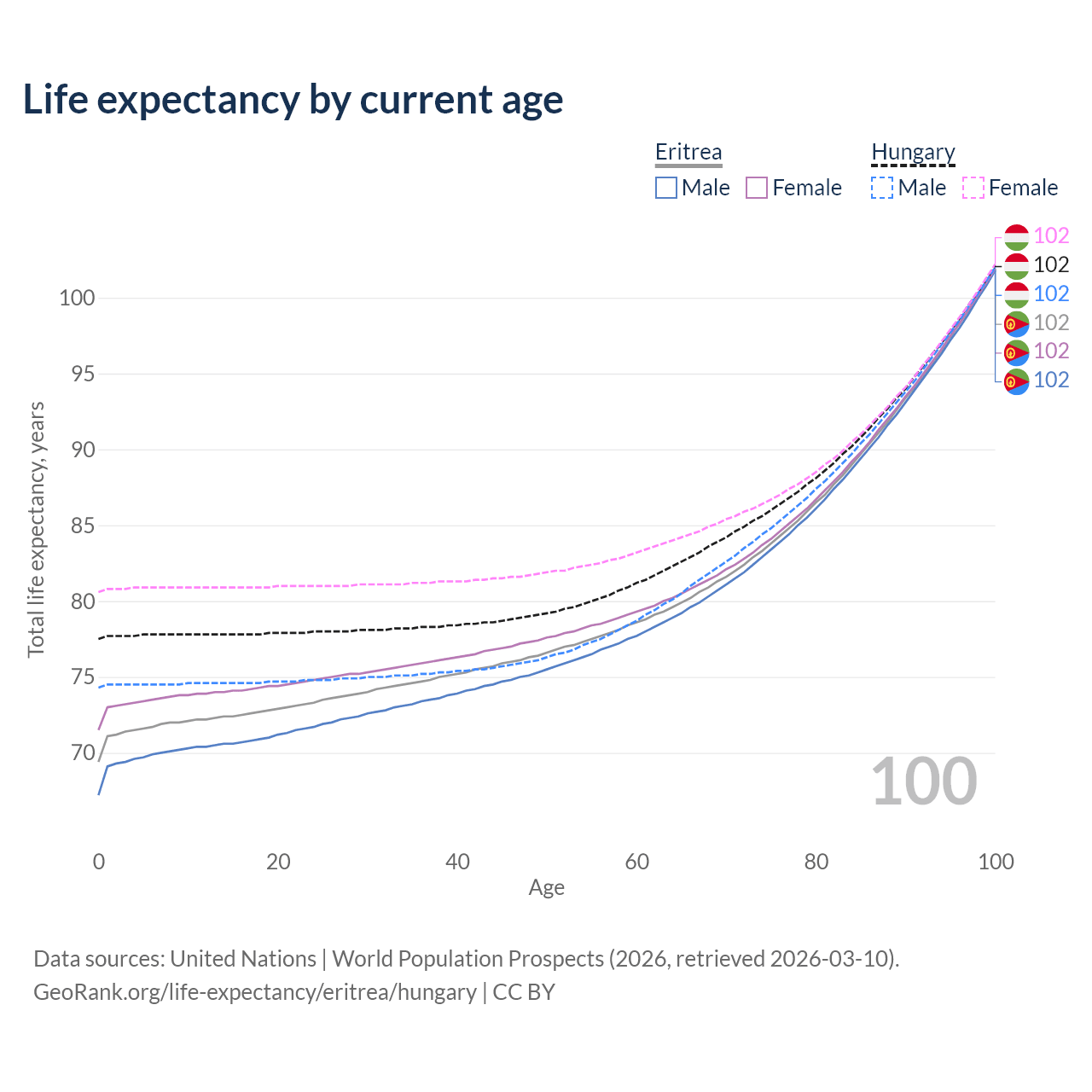 This life expectancy calculator shows the odds of living to 100, 95, 90, and below based on current age for both males and females in Eritrea and Hungary, along with mean and median age of death. The calculations are based on the 2026 life tables (actuarial tables) from the UN World Population Prospects.