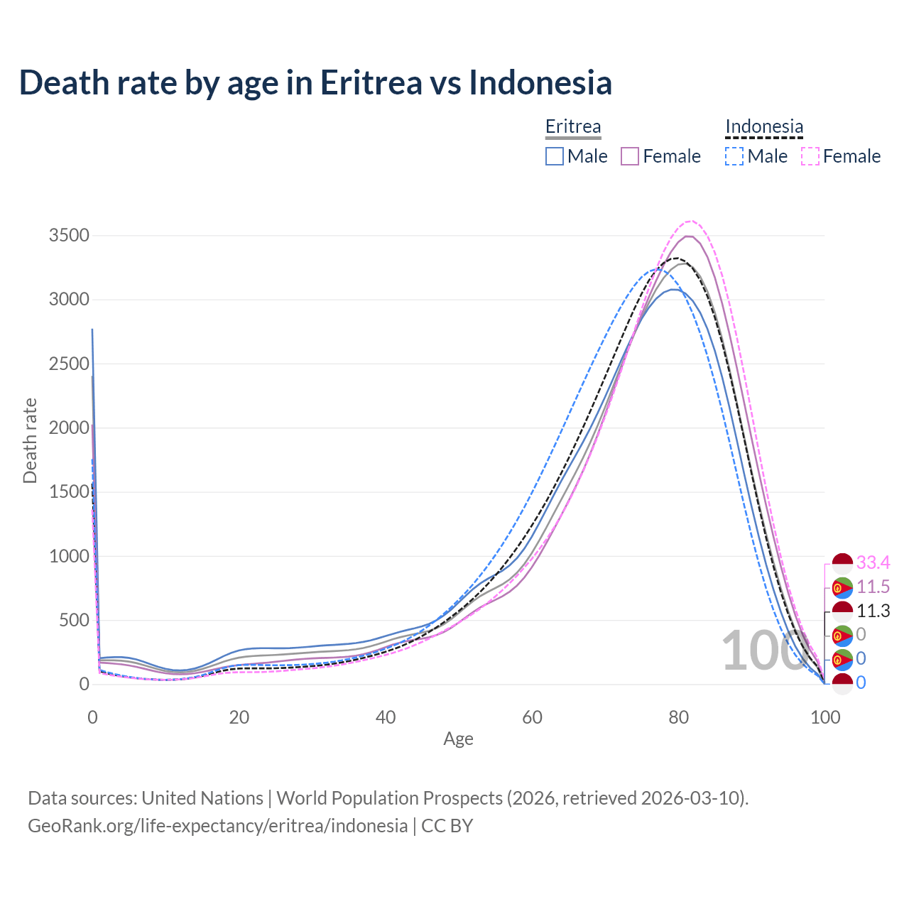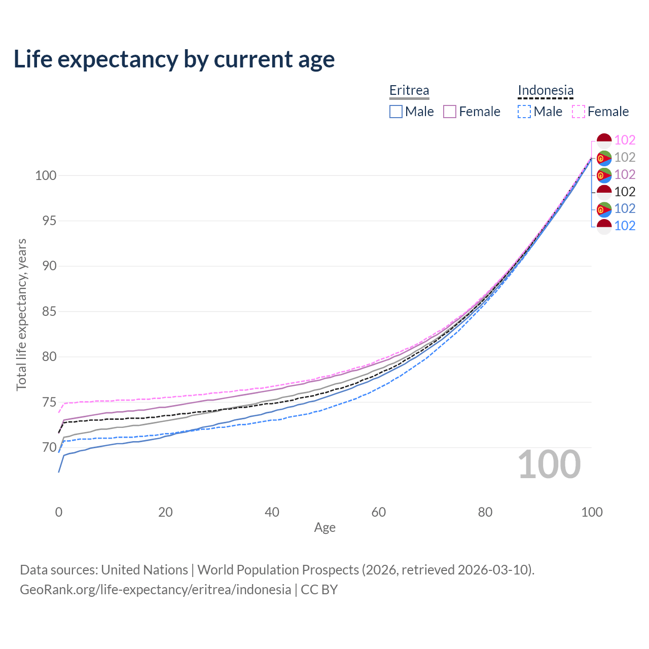 This life expectancy calculator shows the odds of living to 100, 95, 90, and below based on current age for both males and females in Eritrea and Indonesia, along with mean and median age of death. The calculations are based on the 2026 life tables (actuarial tables) from the UN World Population Prospects.