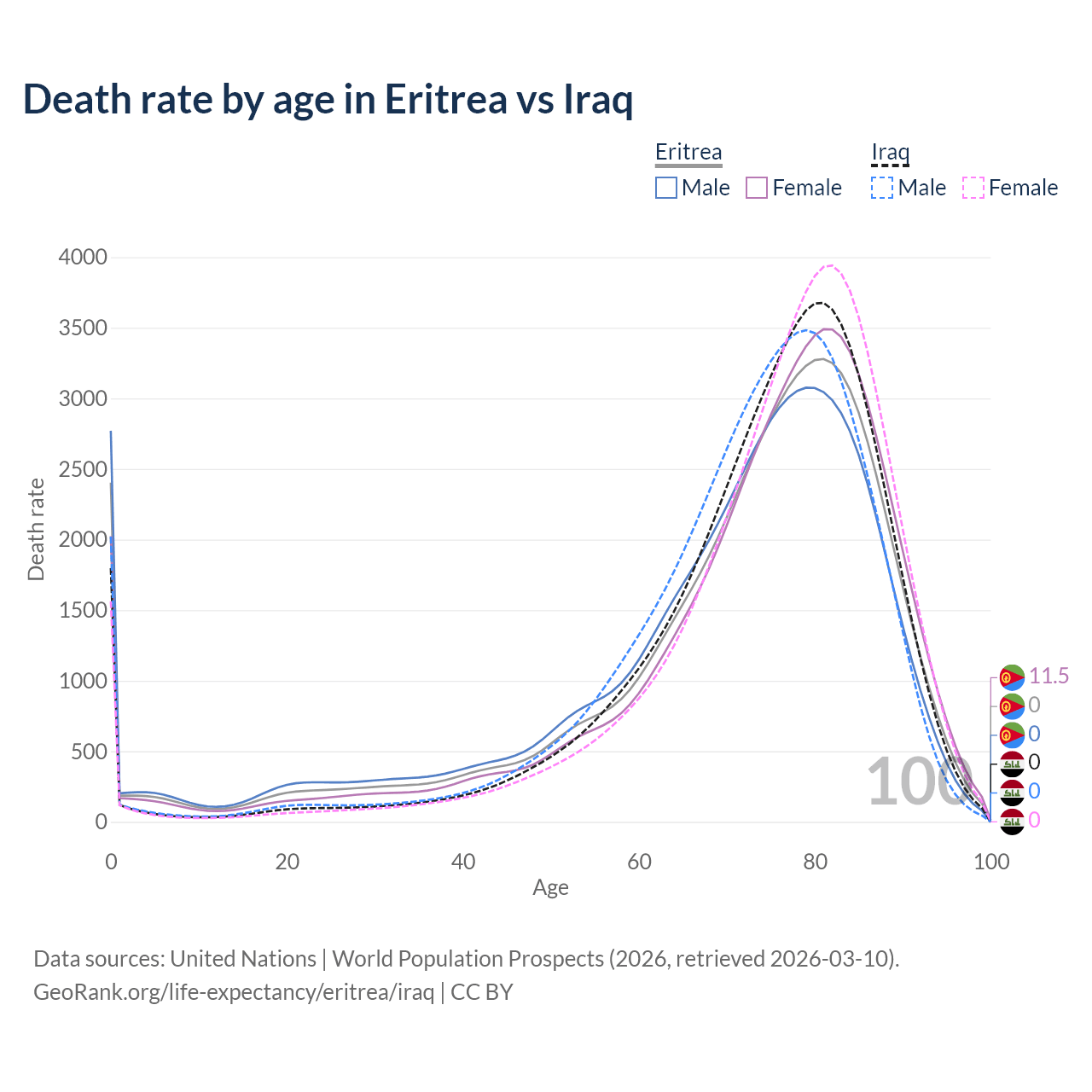This life expectancy calculator shows the odds of living to 100, 95, 90, and below based on current age for both males and females in Eritrea and Iraq, along with mean and median age of death. The calculations are based on the 2026 life tables (actuarial tables) from the UN World Population Prospects.