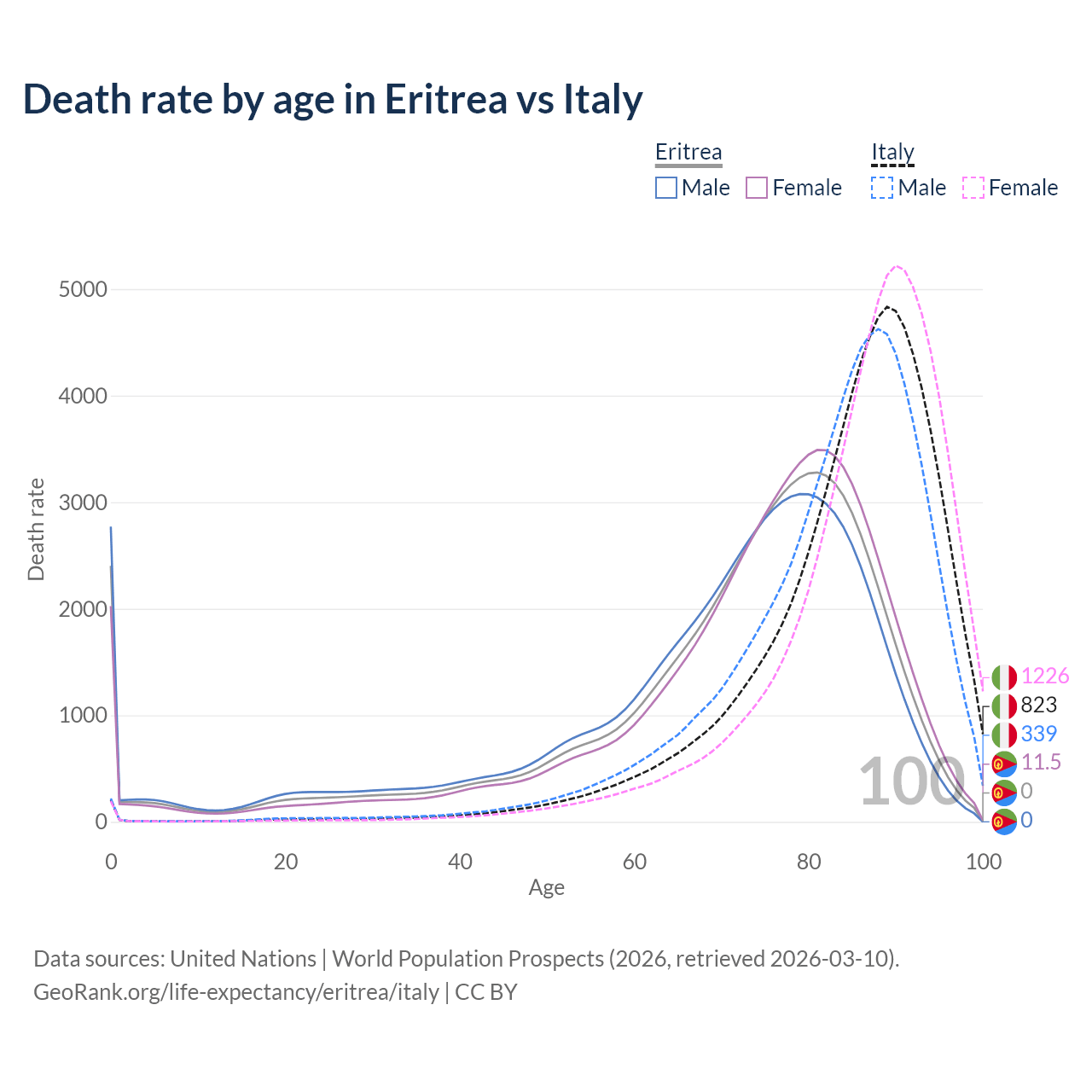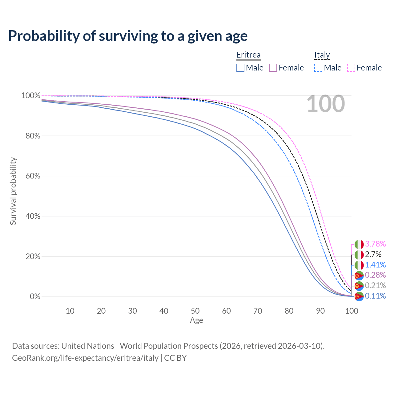 This life expectancy calculator shows the odds of living to 100, 95, 90, and below based on current age for both males and females in Eritrea and Italy, along with mean and median age of death. The calculations are based on the 2026 life tables (actuarial tables) from the UN World Population Prospects.