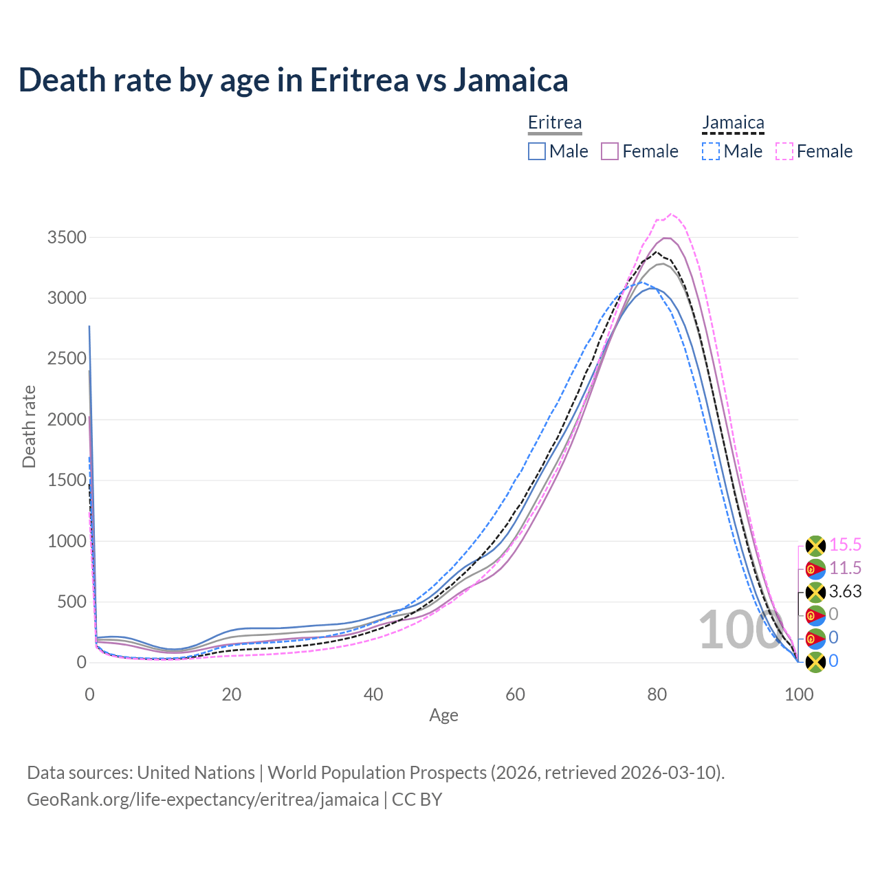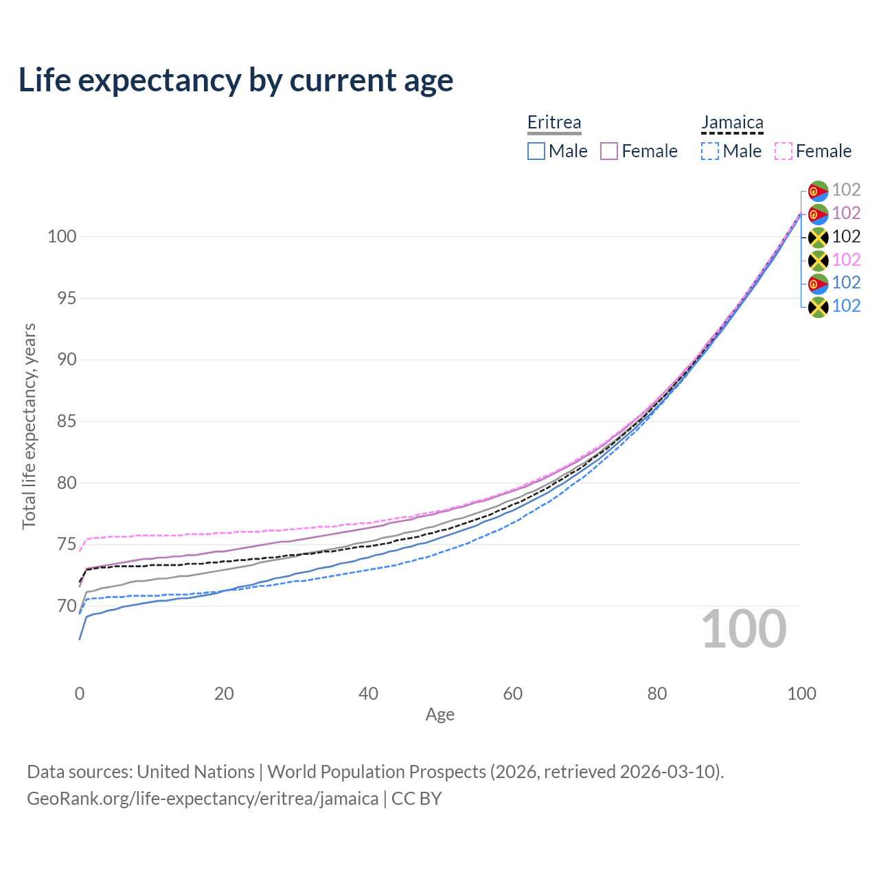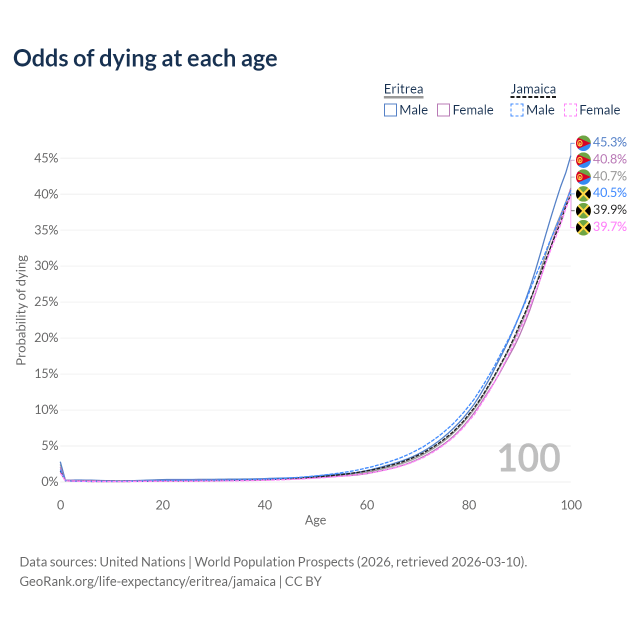 This life expectancy calculator shows the odds of living to 100, 95, 90, and below based on current age for both males and females in Eritrea and Jamaica, along with mean and median age of death. The calculations are based on the 2026 life tables (actuarial tables) from the UN World Population Prospects.