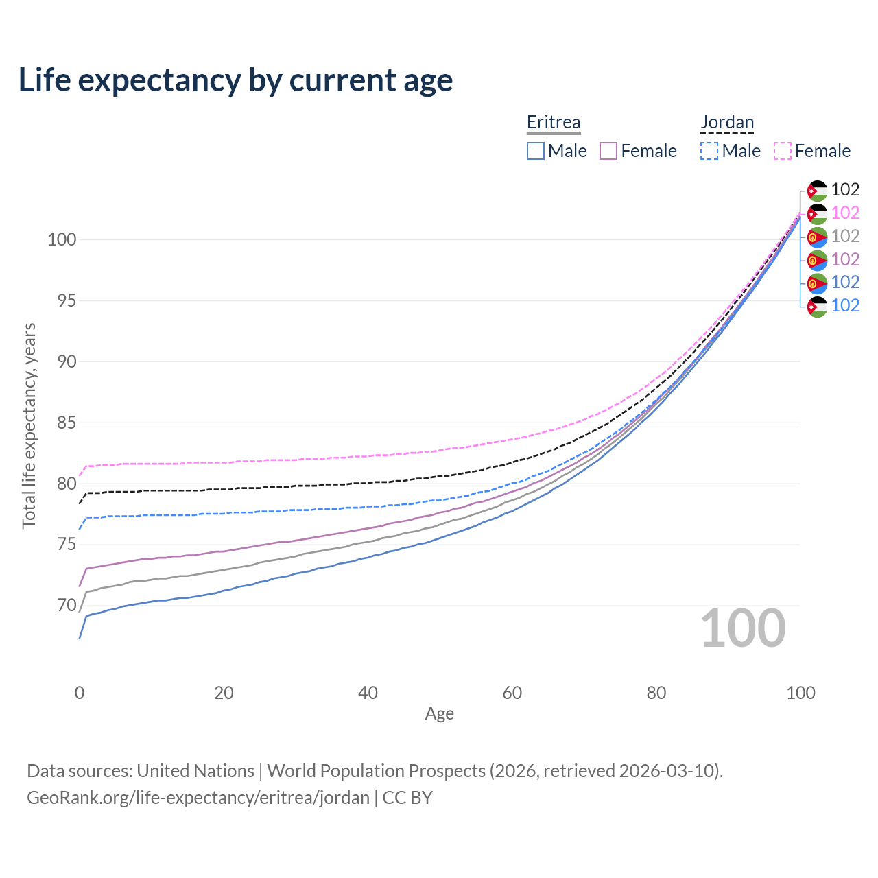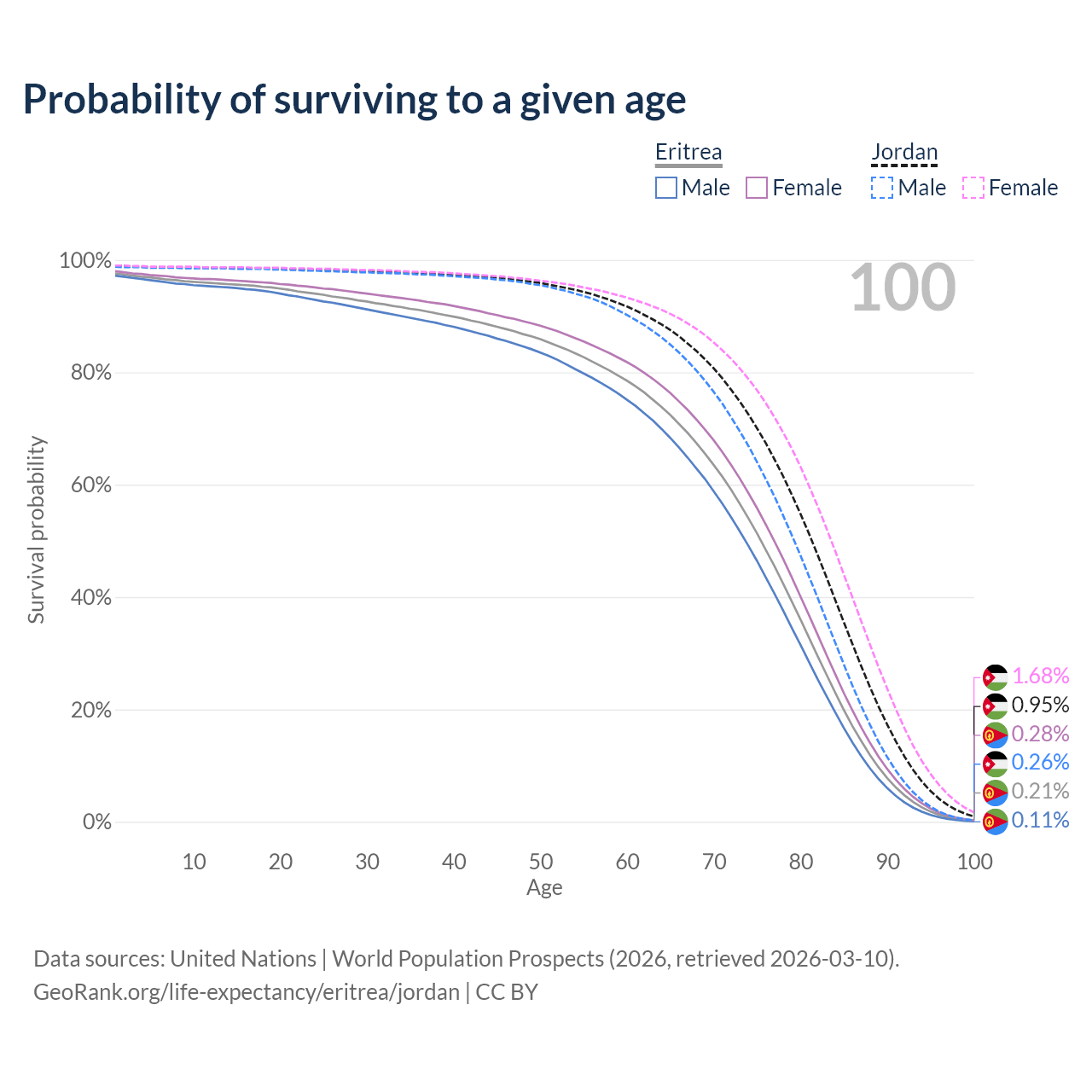 This life expectancy calculator shows the odds of living to 100, 95, 90, and below based on current age for both males and females in Eritrea and Jordan, along with mean and median age of death. The calculations are based on the 2026 life tables (actuarial tables) from the UN World Population Prospects.