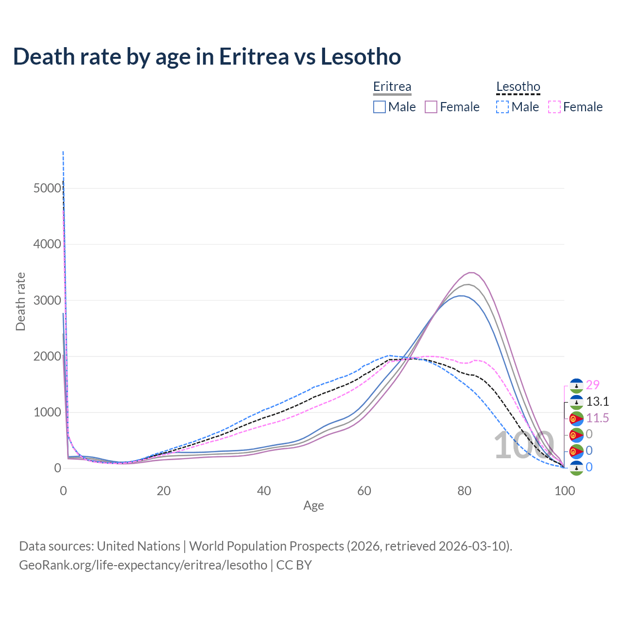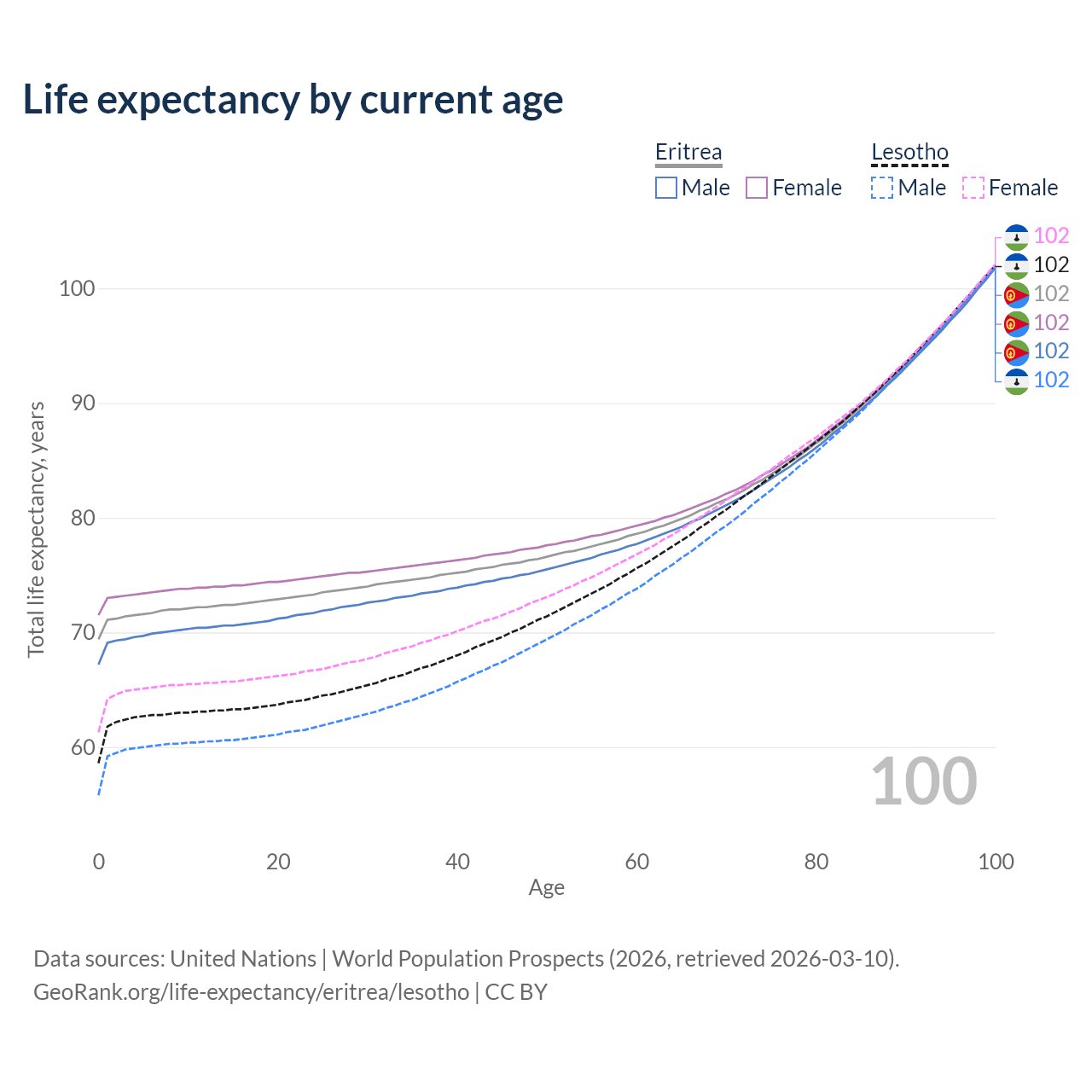 This life expectancy calculator shows the odds of living to 100, 95, 90, and below based on current age for both males and females in Eritrea and Lesotho, along with mean and median age of death. The calculations are based on the 2026 life tables (actuarial tables) from the UN World Population Prospects.