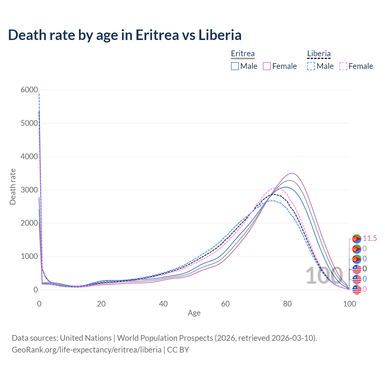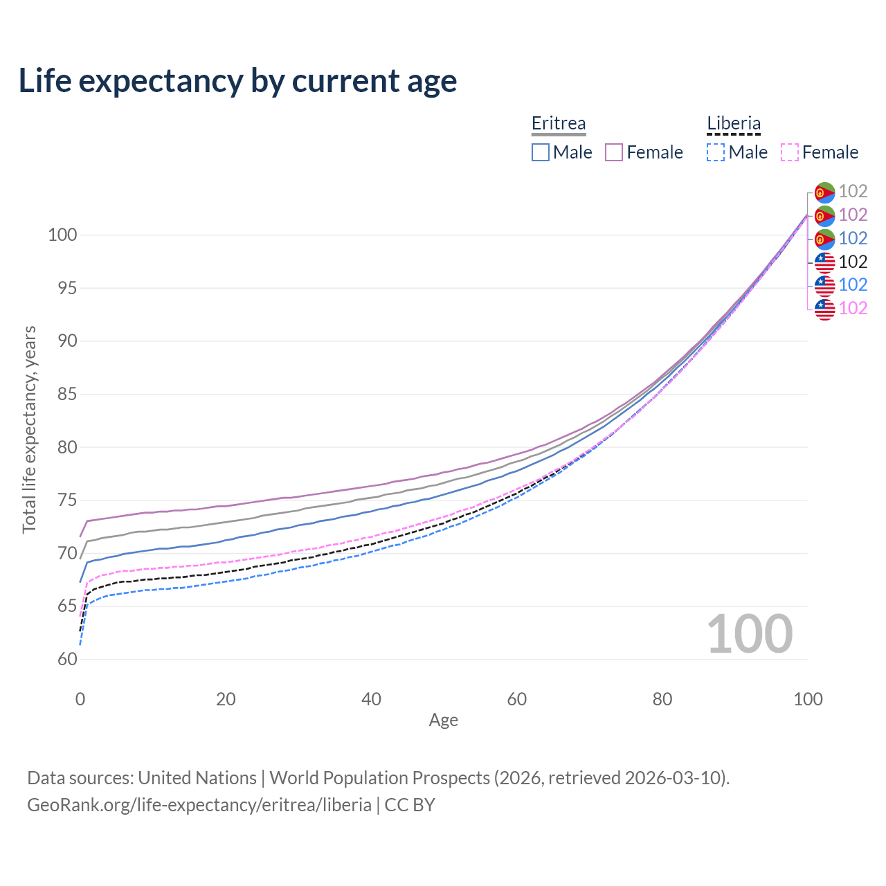 This life expectancy calculator shows the odds of living to 100, 95, 90, and below based on current age for both males and females in Eritrea and Liberia, along with mean and median age of death. The calculations are based on the 2026 life tables (actuarial tables) from the UN World Population Prospects.