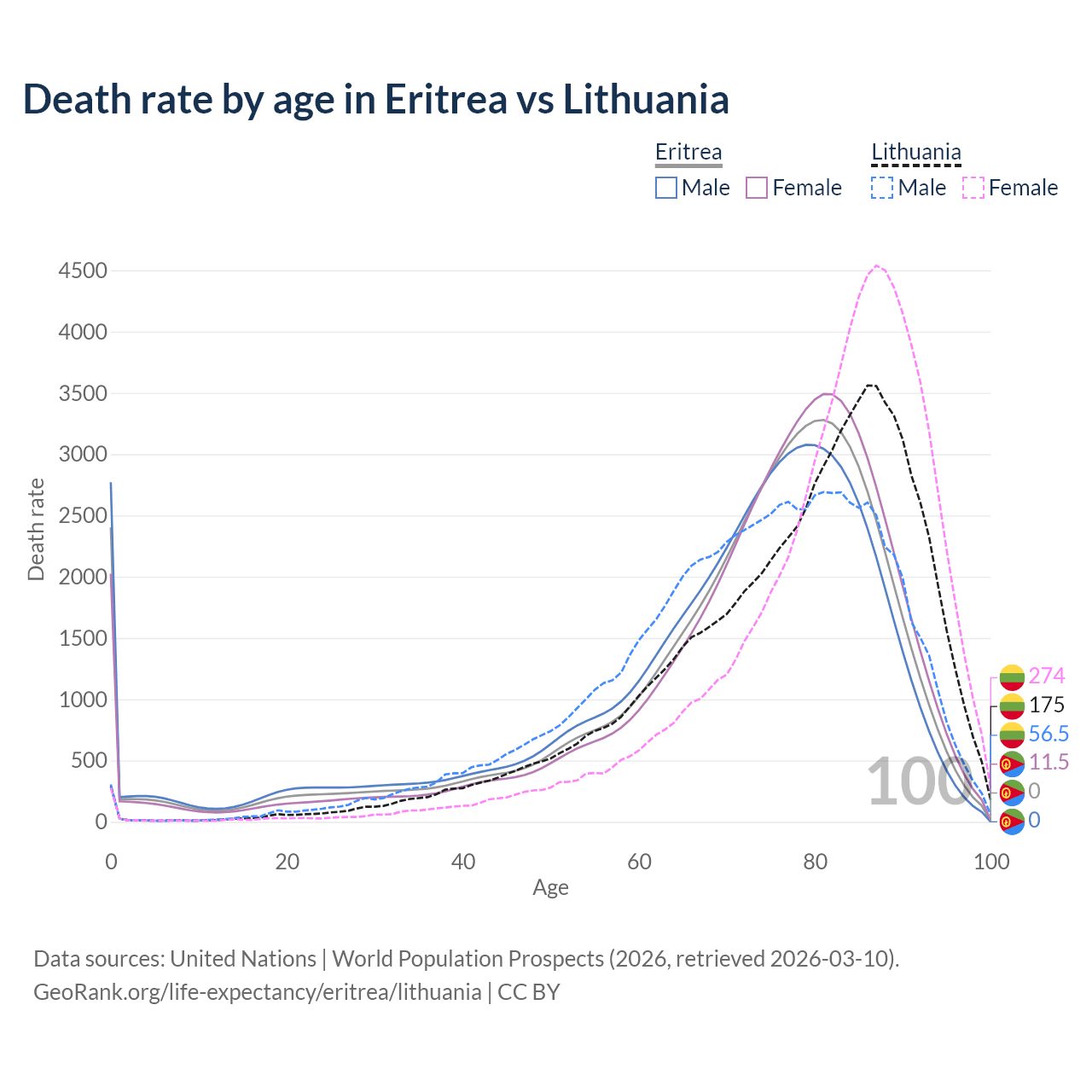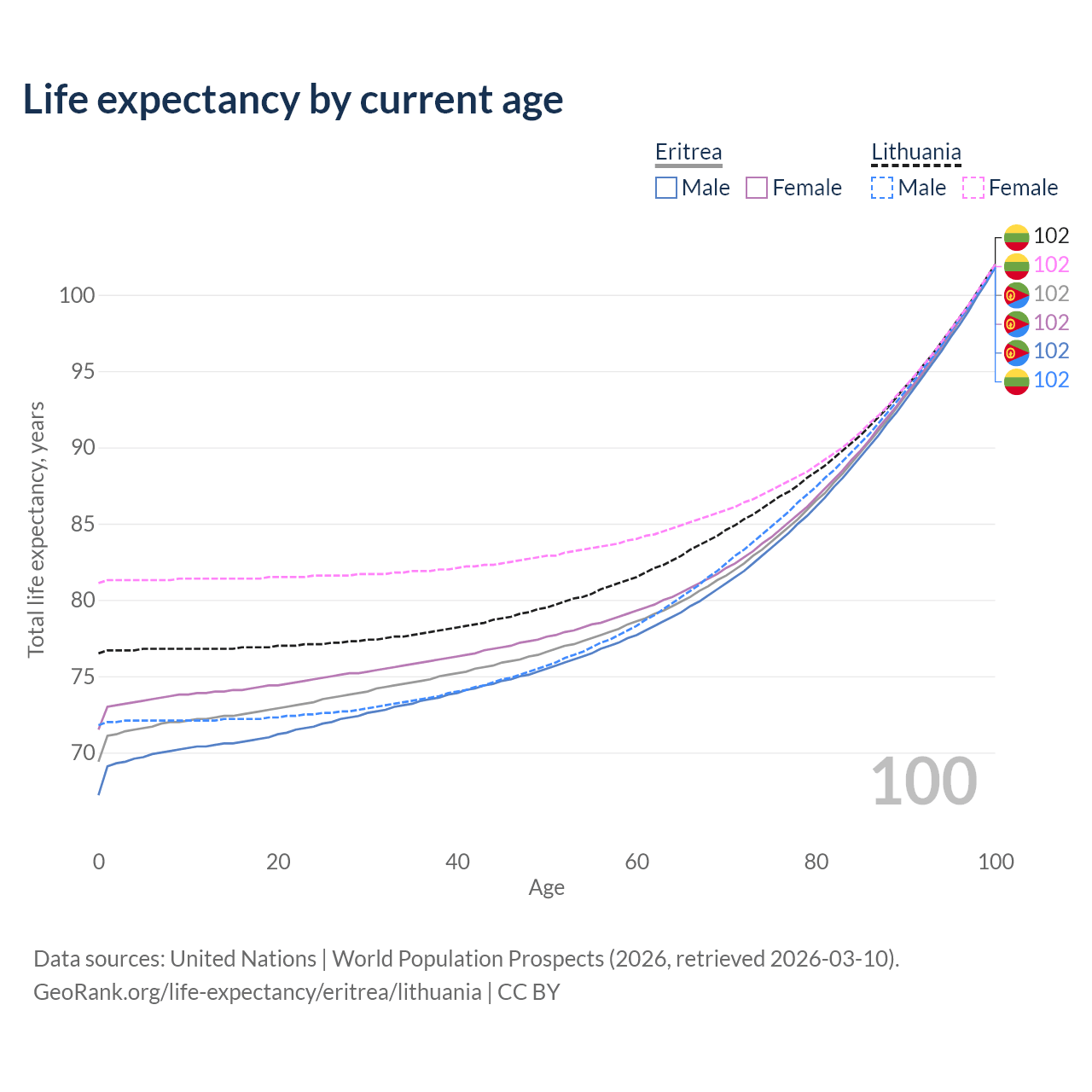 This life expectancy calculator shows the odds of living to 100, 95, 90, and below based on current age for both males and females in Eritrea and Lithuania, along with mean and median age of death. The calculations are based on the 2026 life tables (actuarial tables) from the UN World Population Prospects.