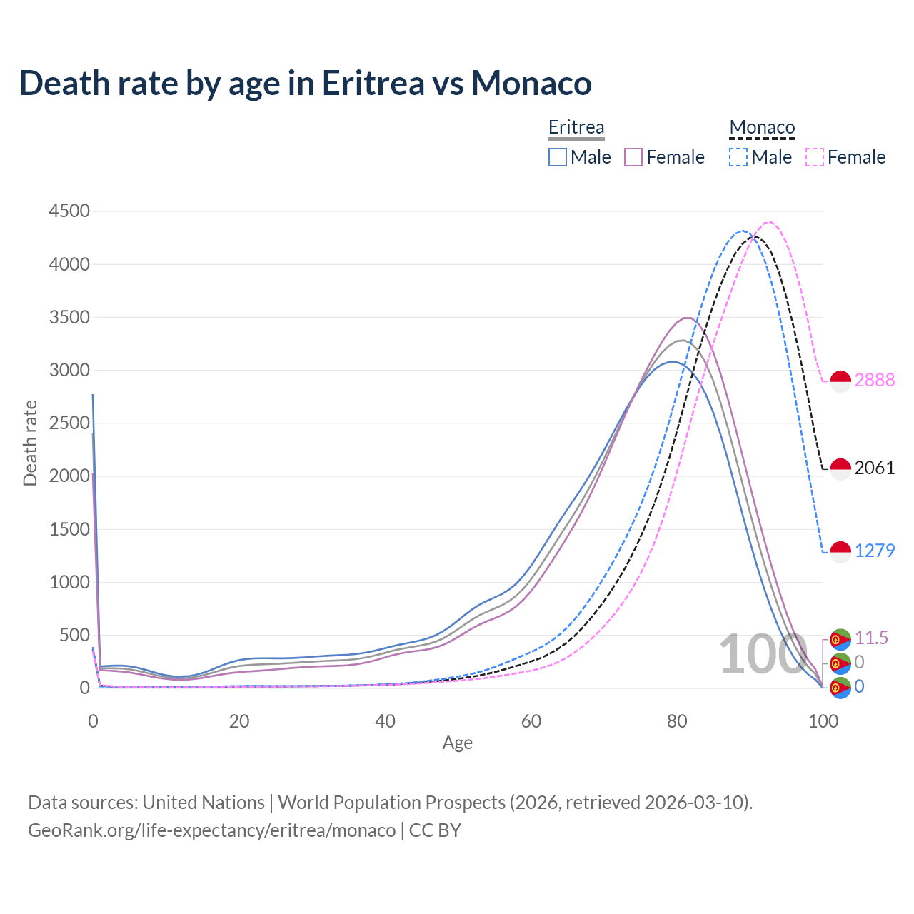 In Eritrea, the most common age of death is 81, compared to 91 in Monaco. The median age of death is 75.5 in Eritrea and 88.7 in Monaco, meaning only half of each cohort is expected to live past that age.