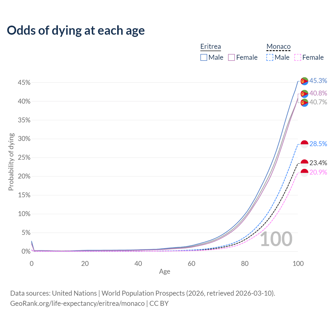 This life expectancy calculator shows the odds of living to 100, 95, 90, and below based on current age for both males and females in Eritrea and Monaco, along with mean and median age of death. The calculations are based on the 2026 life tables (actuarial tables) from the UN World Population Prospects.