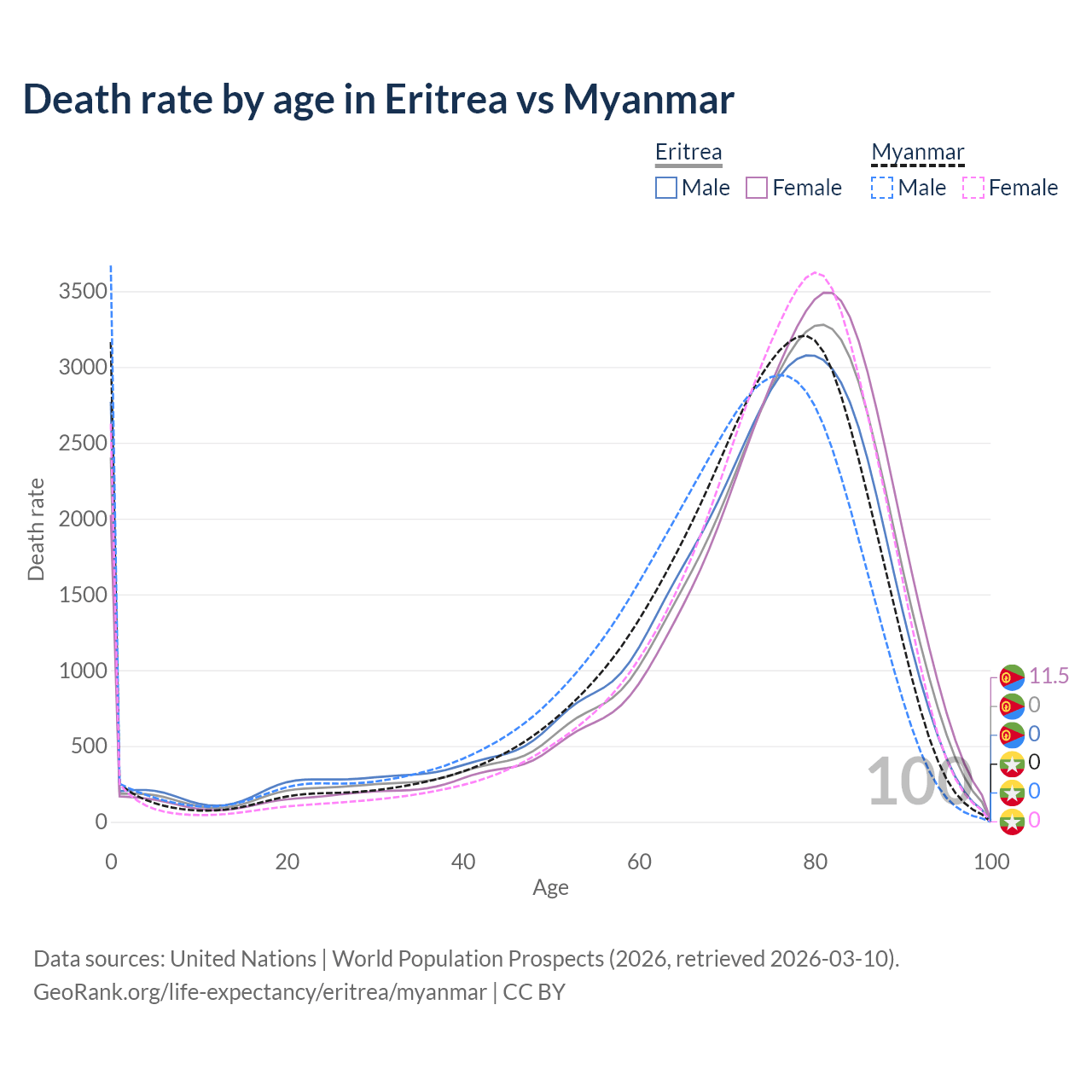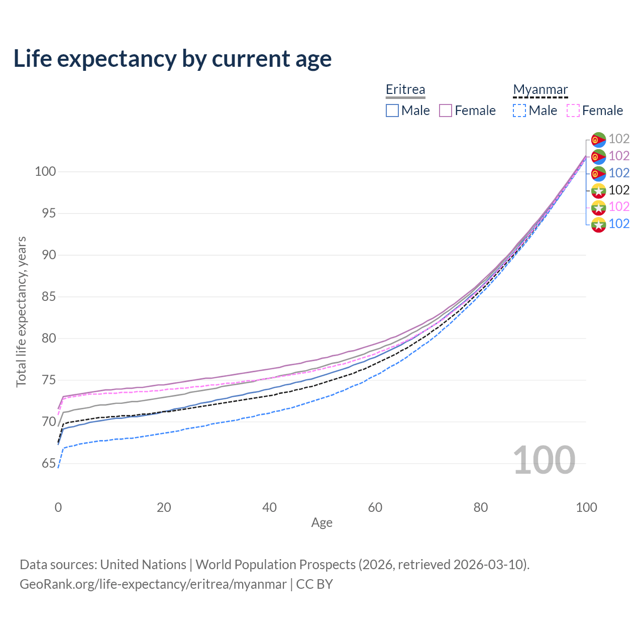 This life expectancy calculator shows the odds of living to 100, 95, 90, and below based on current age for both males and females in Eritrea and Myanmar, along with mean and median age of death. The calculations are based on the 2026 life tables (actuarial tables) from the UN World Population Prospects.