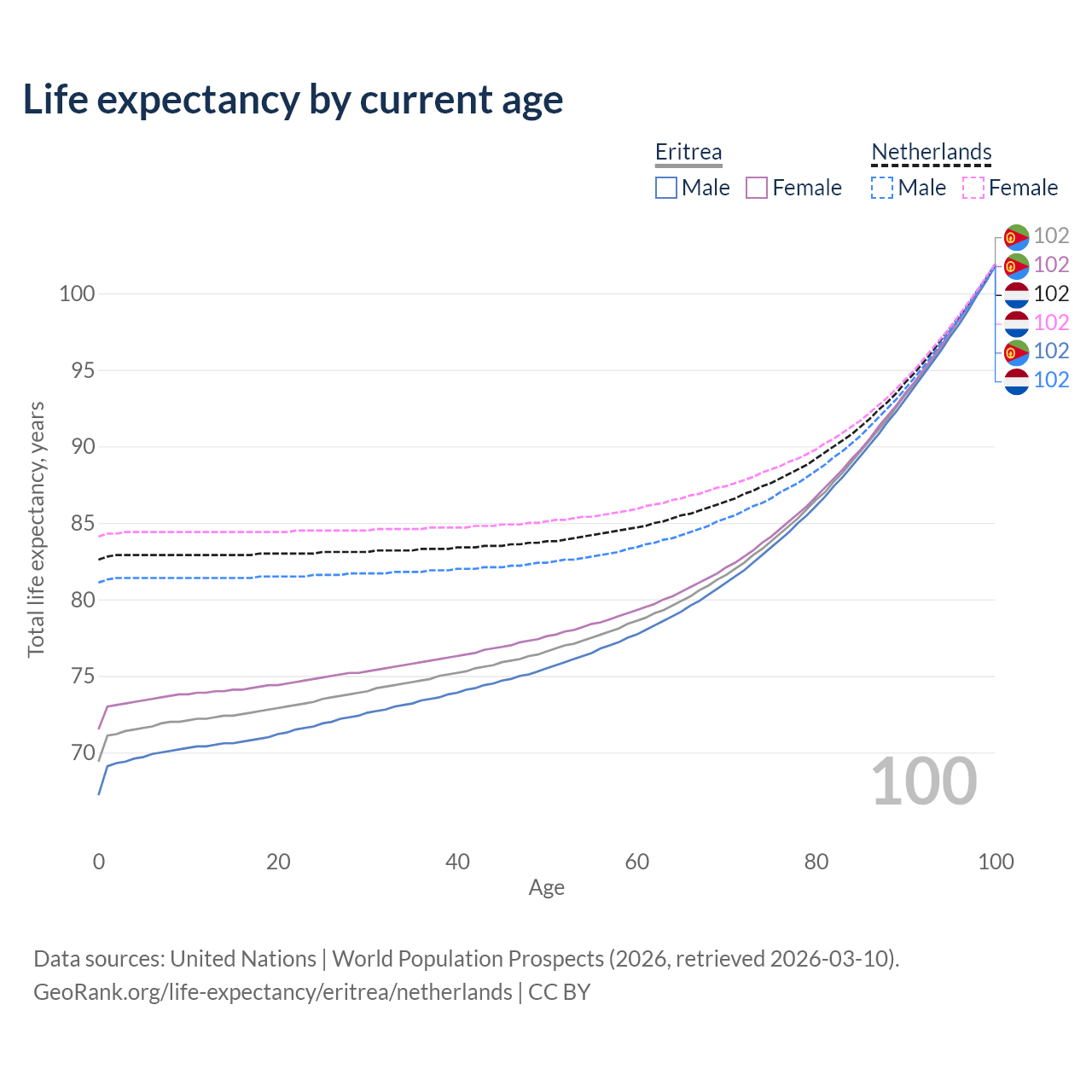 This life expectancy calculator shows the odds of living to 100, 95, 90, and below based on current age for both males and females in Eritrea and the Netherlands, along with mean and median age of death. The calculations are based on the 2026 life tables (actuarial tables) from the UN World Population Prospects.