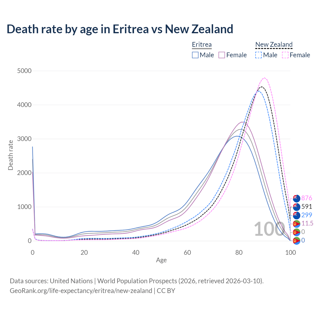 In Eritrea, the most common age of death is 81, compared to 89 in New Zealand. The median age of death is 75.5 in Eritrea and 85.8 in New Zealand, meaning only half of each cohort is expected to live past that age.