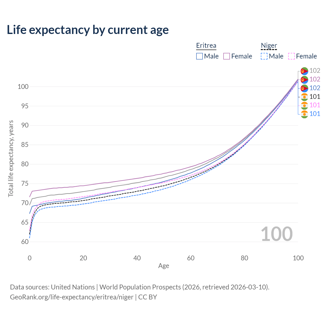 This life expectancy calculator shows the odds of living to 100, 95, 90, and below based on current age for both males and females in Eritrea and Niger, along with mean and median age of death. The calculations are based on the 2026 life tables (actuarial tables) from the UN World Population Prospects.