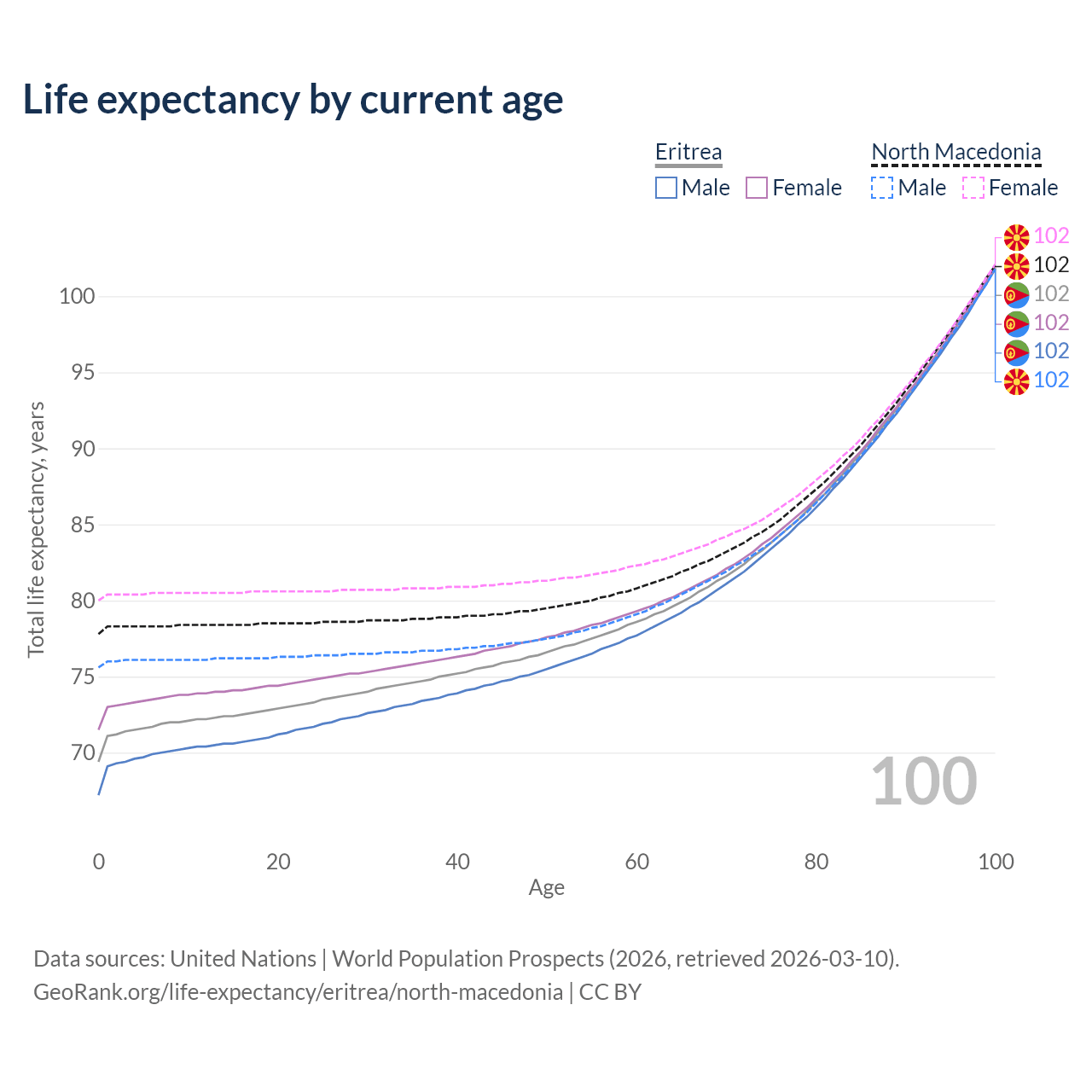 This life expectancy calculator shows the odds of living to 100, 95, 90, and below based on current age for both males and females in Eritrea and North Macedonia, along with mean and median age of death. The calculations are based on the 2026 life tables (actuarial tables) from the UN World Population Prospects.