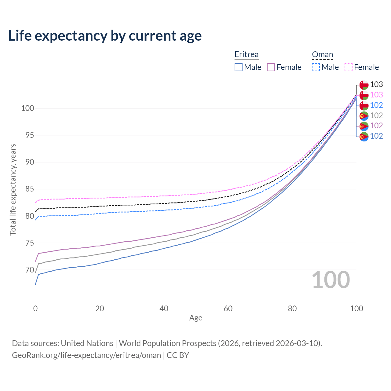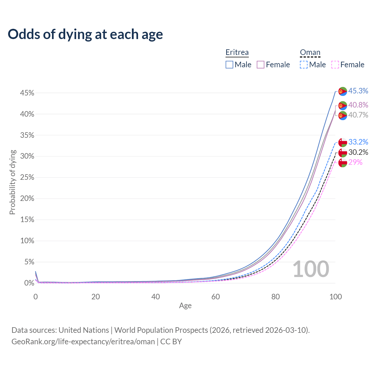 This life expectancy calculator shows the odds of living to 100, 95, 90, and below based on current age for both males and females in Eritrea and Oman, along with mean and median age of death. The calculations are based on the 2026 life tables (actuarial tables) from the UN World Population Prospects.
