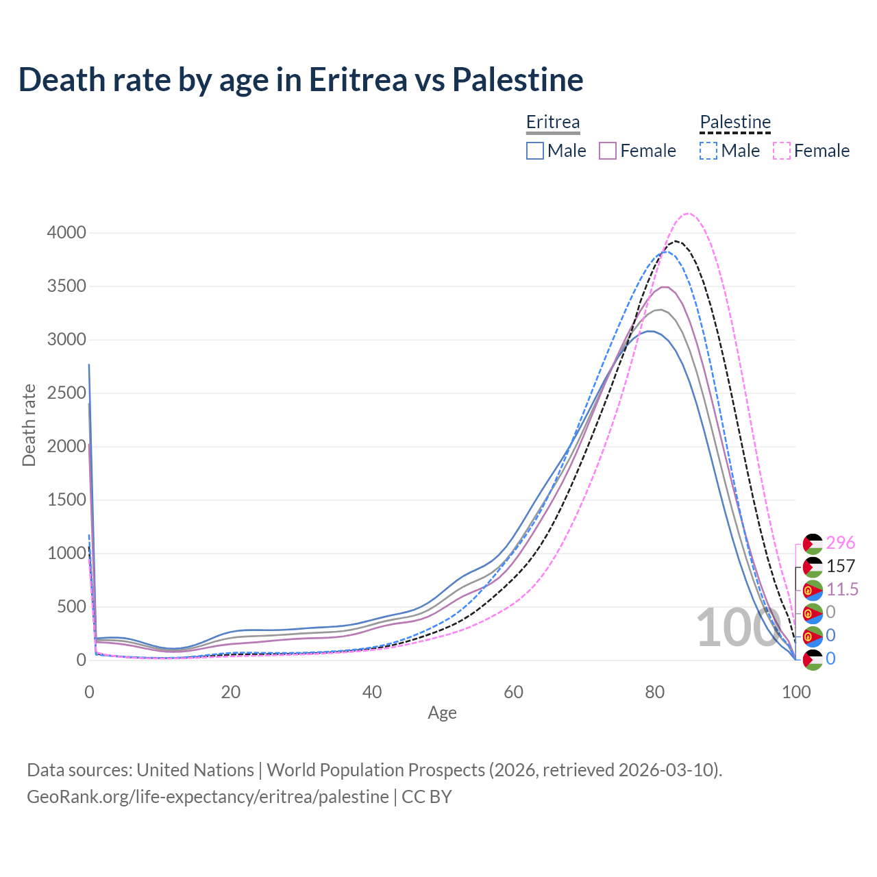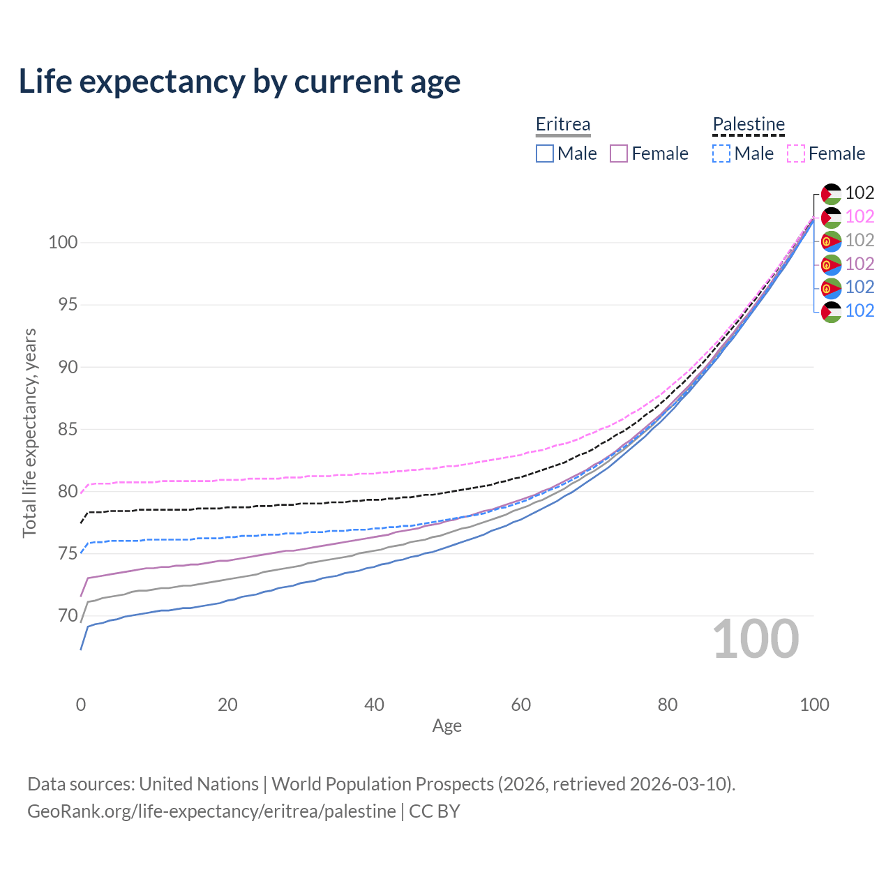 This life expectancy calculator shows the odds of living to 100, 95, 90, and below based on current age for both males and females in Eritrea and Palestine, along with mean and median age of death. The calculations are based on the 2026 life tables (actuarial tables) from the UN World Population Prospects.